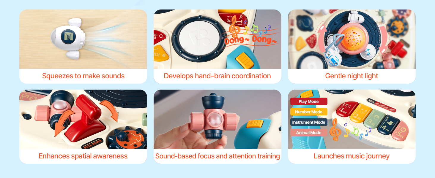 Tento stolík pre batoľatá obsahuje 10 pesničiek, 10 MIDI efektov, režim čísel a 4 režimy klavíra. Deti ťukajú na odnímateľnú píšťalku v tvare vesmírnej lode, stlačiteľnú loď, perkusné tlačidlá, bludisko s korálikmi a ozubené kolesá – potom otočia vrchnú časť na veľký blokový stolík s mäkkým projektorom hviezd.