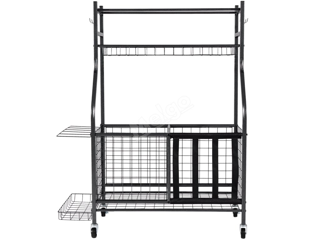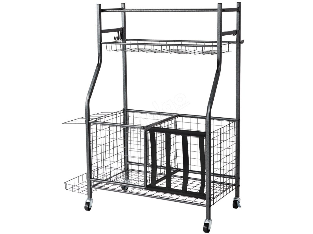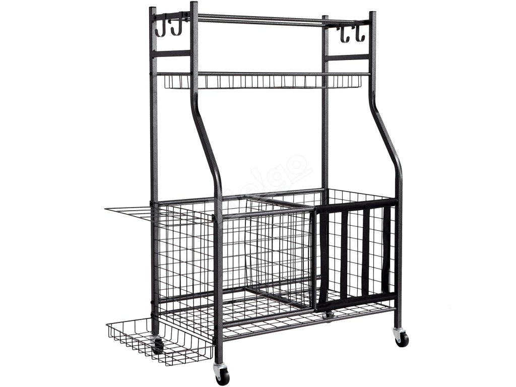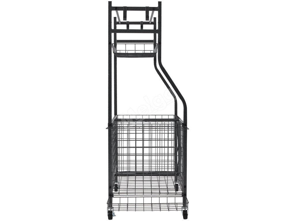 Odnímateľné háčiky zväčšujú úložný priestor a metódy; nová bočná polica uľahčuje umiestnenie rôznych rakiet a palíc; elastické pásy maximalizujú úložný priestor športového úložného vozíka a uľahčujú prístup k položkám v spodnej časti; uzamykateľné kolieska spĺňajú vaše potreby na mobilitu.