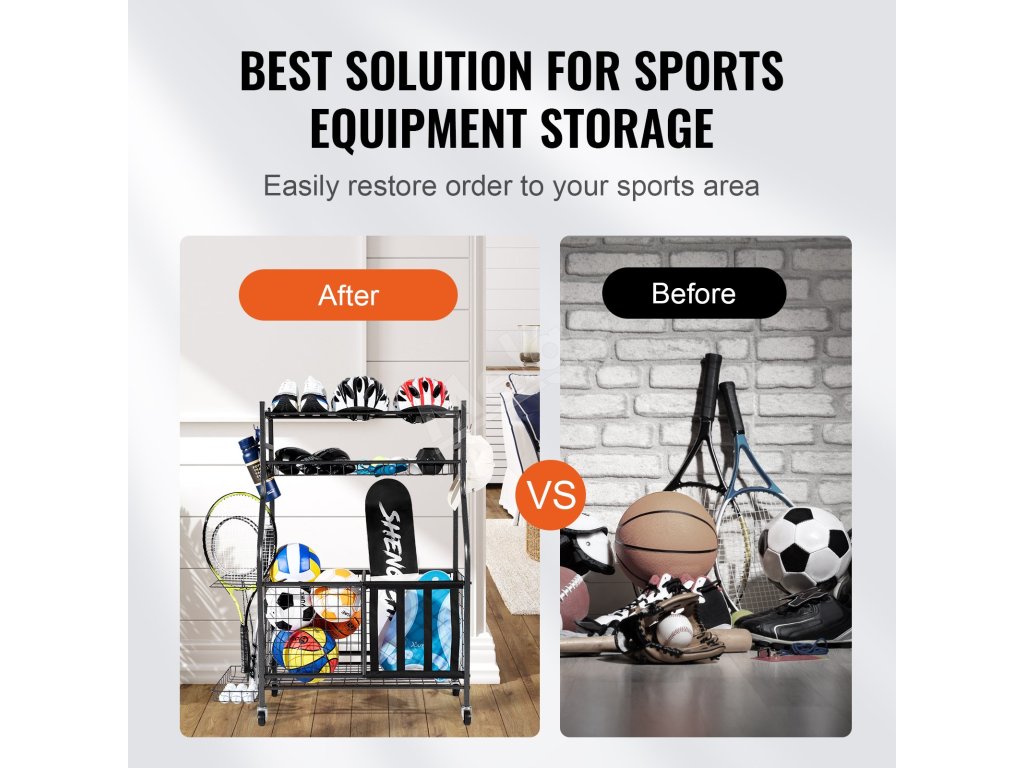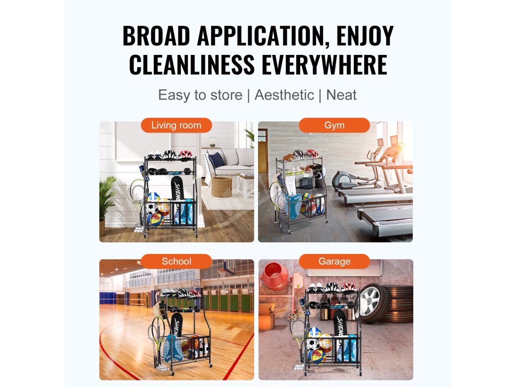 Tento organizér na uskladnenie športového náčinia je vyrobený z odolných oceľových rámov s práškovou povrchovou úpravou a ťažkej kovovej drôtenej siete, ktorá je trvanlivá a odolná proti opotrebovaniu na mnoho rokov používania. Textúrovaný náter odolný proti poškriabaniu, vodotesný, nehrdzavejúci a odolný voči poškriabaniu, čo zaručuje dlhšiu životnosť úložného riešenia.