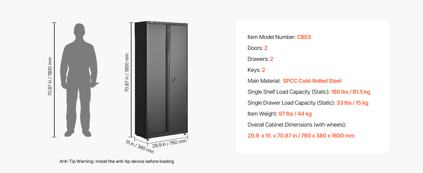 | Celkové rozmery skrine (s kolieskami) | 29,9 x 15 x 70,87 palca / 760 x 380 x 1800 mm |