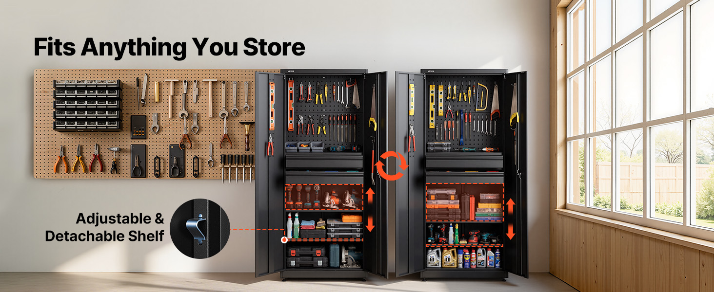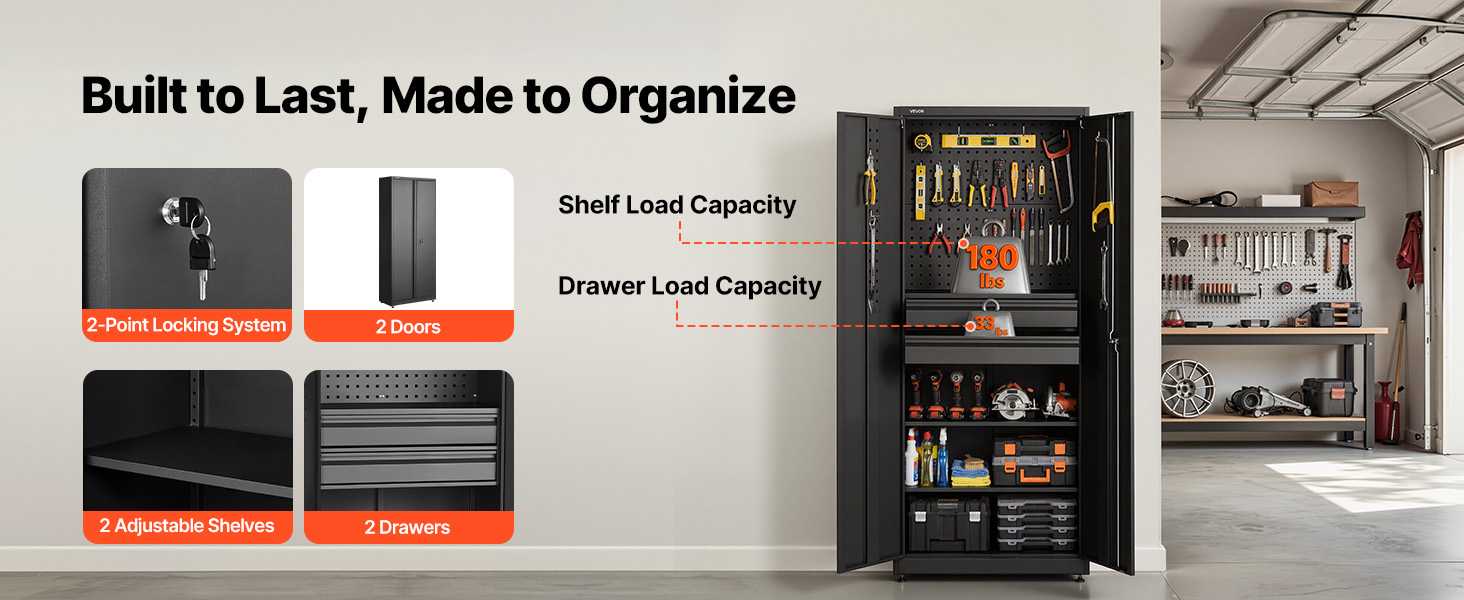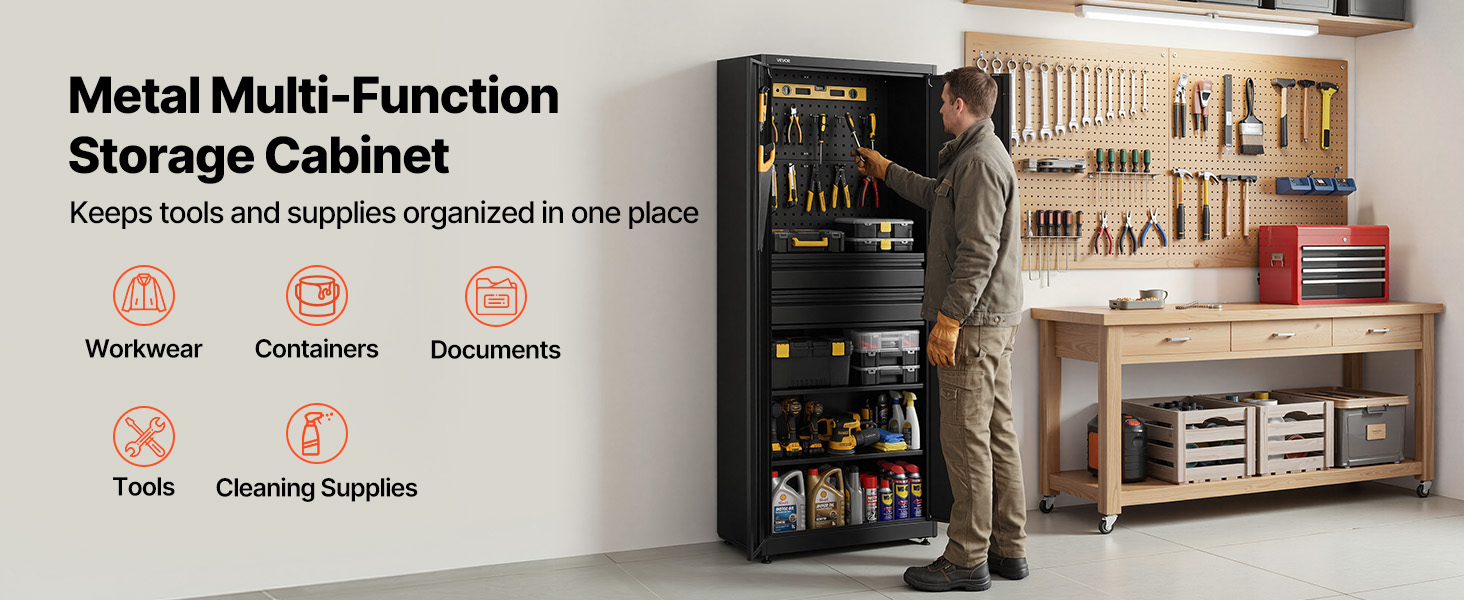 Táto uzamykateľná úložná skriňa je vybavená hornou doskou s dvojitým využitím na zavesenie náradia alebo dodatočné police. Navyše, nastaviteľné police sa dajú ľahko zdvihnúť alebo spustiť, aby sa do nich vošli predmety rôznych veľkostí.