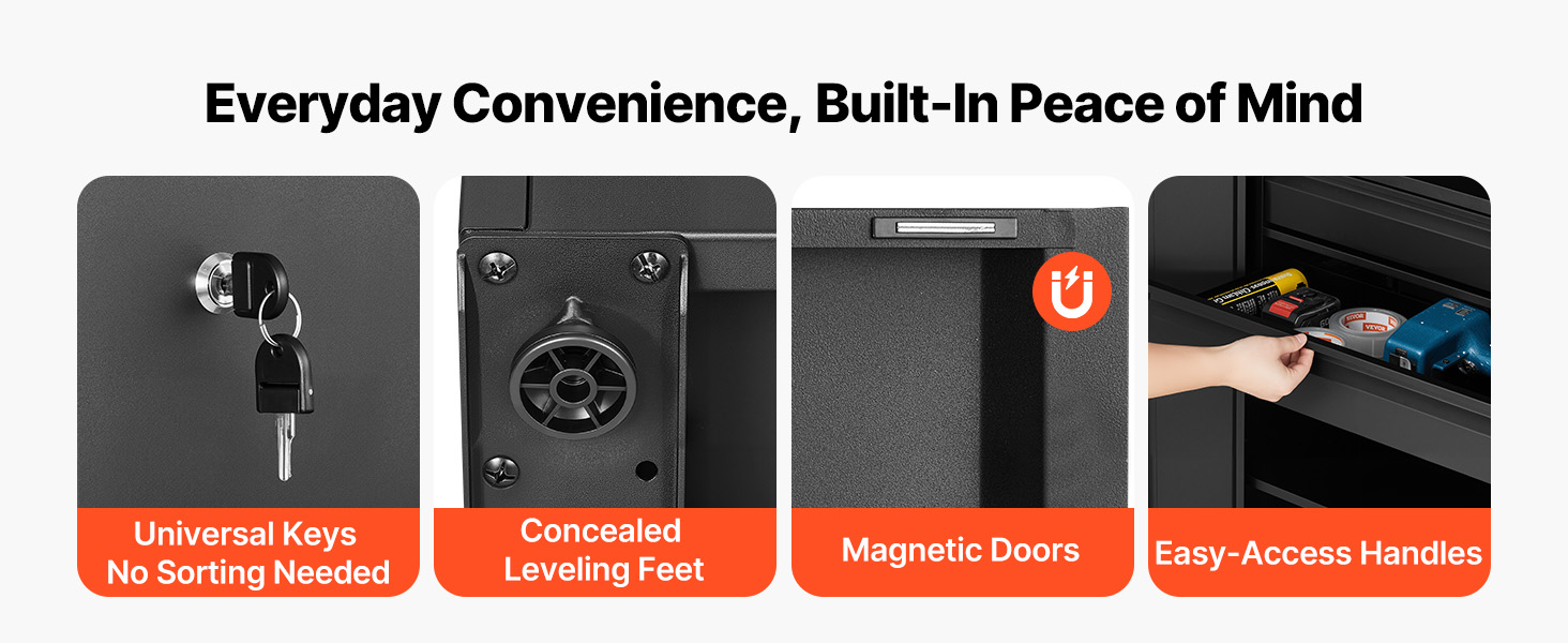 Skryté vyrovnávacie nožičky, rukoväte s ľahkým uchopením a bezpečné zamykanie umožňujú, aby sa táto oceľová garážová skriňa ľahko otvárala, presúvala a zamykala. Rýchlo uchopte náradie a zároveň chráňte cennosti pre bezpečné každodenné skladovanie.