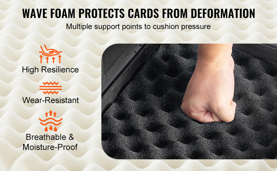Vlnitá pena na hornej strane nášho puzdra na triedené karty ponúka viacero oporných bodov, ktoré tlmia tlak a zabezpečujú, že karty odolávajú deformácii a opotrebovaniu. Vysoko odolná pena je priedušná a odolná voči vlhkosti, vďaka čomu udrží vaše karty v pôvodnom neporušenom stave.