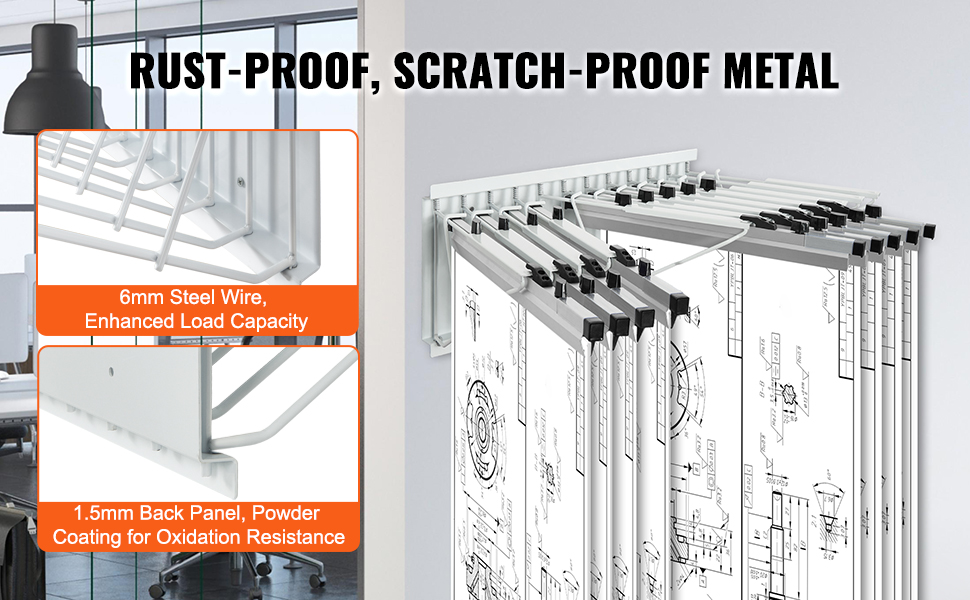 Náš organizér na ukladanie modrotlače je vyrobený z pevnej ocele s práškovým náterom odolným proti korózii a zaručuje dlhodobú životnosť. Priemer drôtu 6 mm zvyšuje nosnosť pre robustnú spoľahlivosť. Dvanásť otočných držiakov uľahčuje umiestnenie potrebných výkresov.