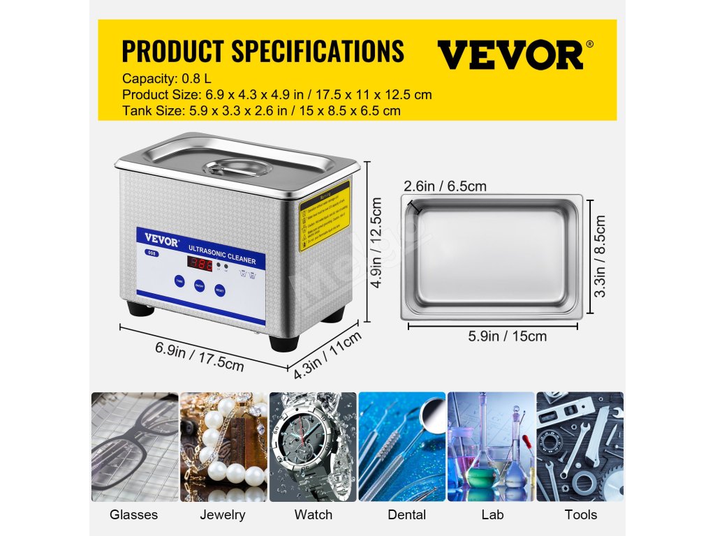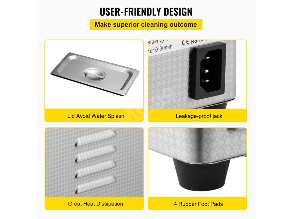Kompaktné rozmery s veľkou 800 ml nádržkou, adekvátnou na dôkladné vyčistenie predmetov naraz. Šetrí čas a úsilie. Tiež s vekom, ktoré zabraňuje striekajúcej vode, nepriepustným konektorom a skvelým odvodom tepla.