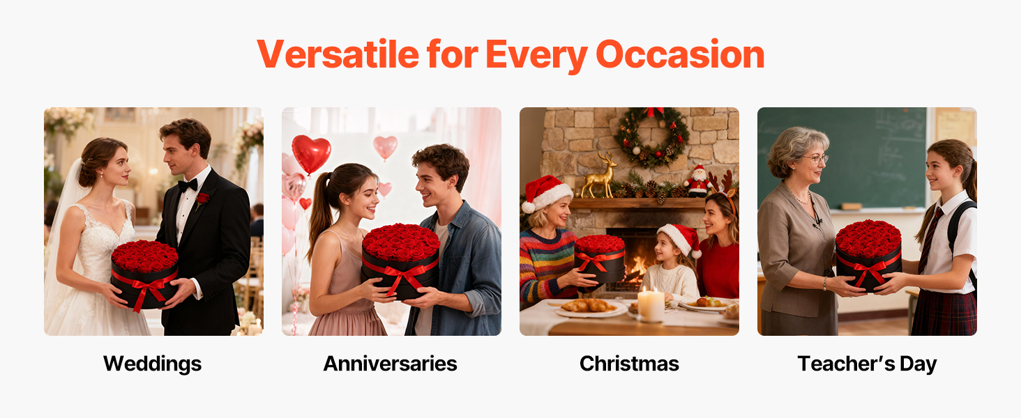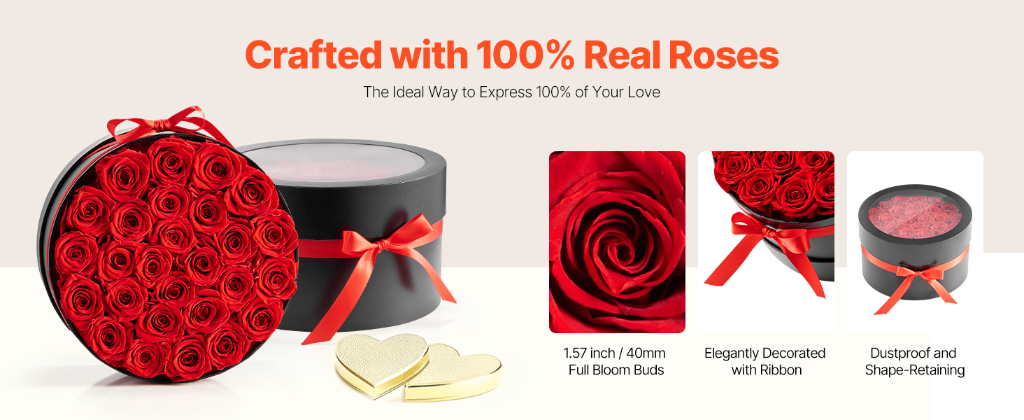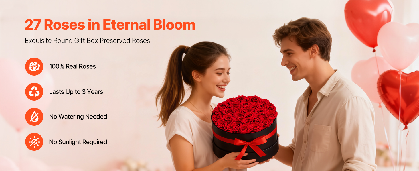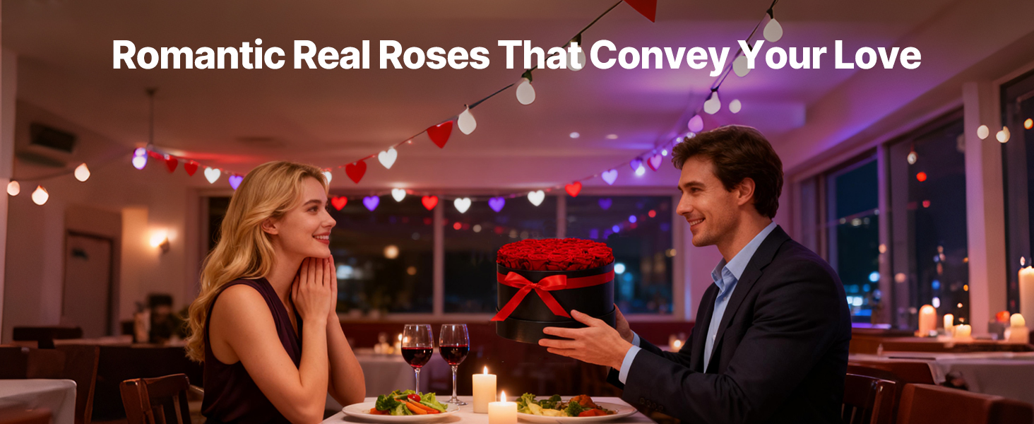 Tieto večné ruže sú vyrobené zo 100 % pravých ruží s plnými kvetmi a žiarivými farbami, nevyžadujú zalievanie ani slnečné svetlo a každú oslavu premenia na trvalú romantickú spomienku.