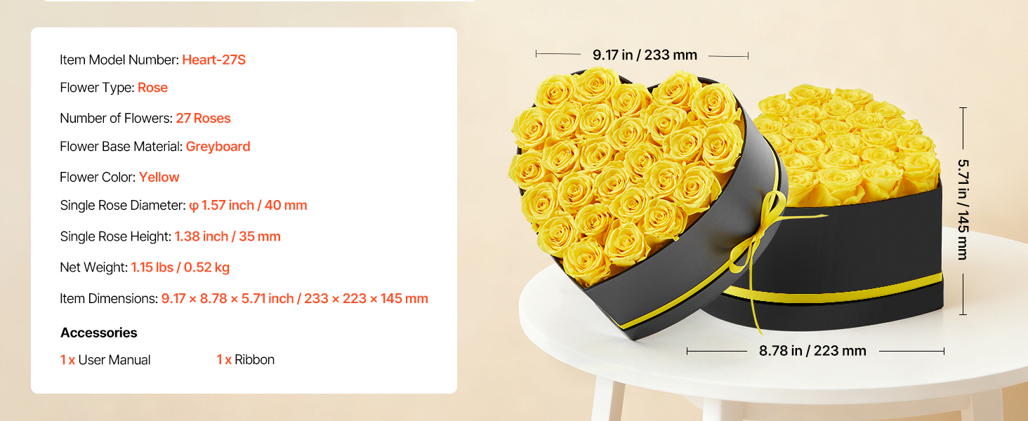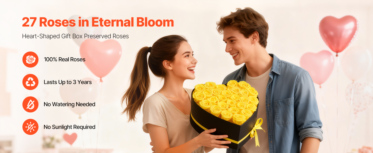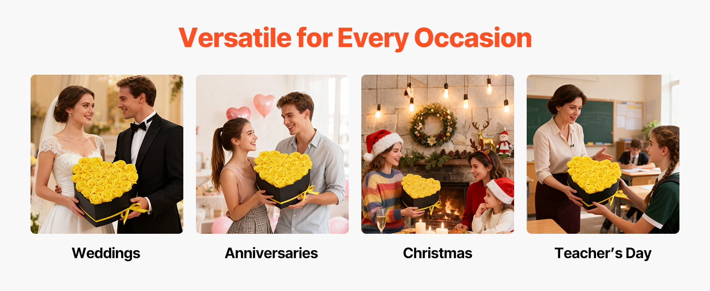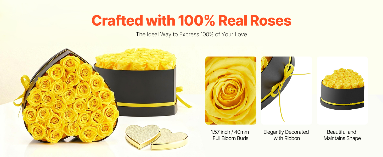 Tieto večné ruže sú vyrobené zo 100 % pravých ruží s plnými kvetmi a žiarivými farbami, nevyžadujú zalievanie ani slnečné svetlo a každú oslavu premenia na trvalú romantickú spomienku.