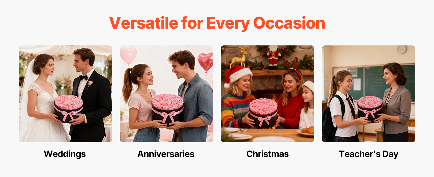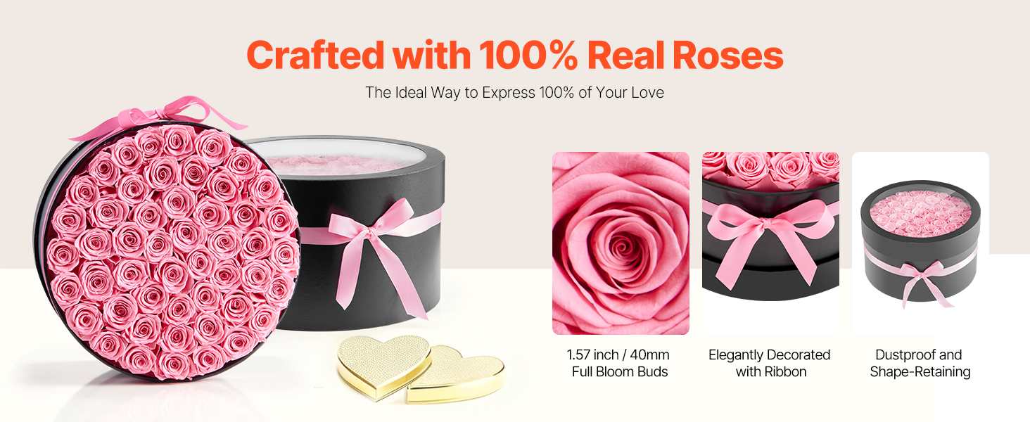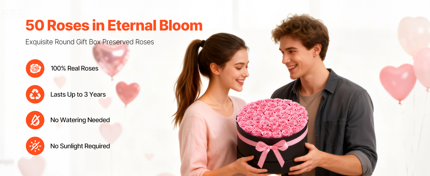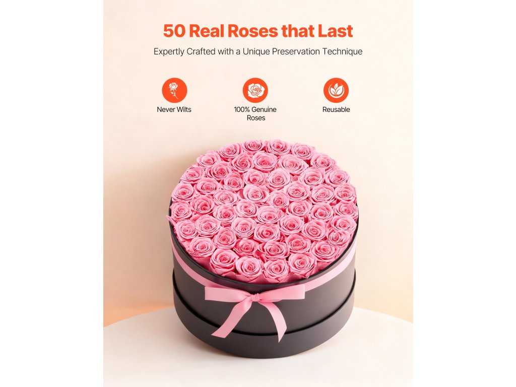Tieto večné ruže sú vyrobené zo 100 % pravých ruží s plnými kvetmi a žiarivými farbami, nevyžadujú zalievanie ani slnečné svetlo a každú oslavu premenia na trvalú romantickú spomienku.