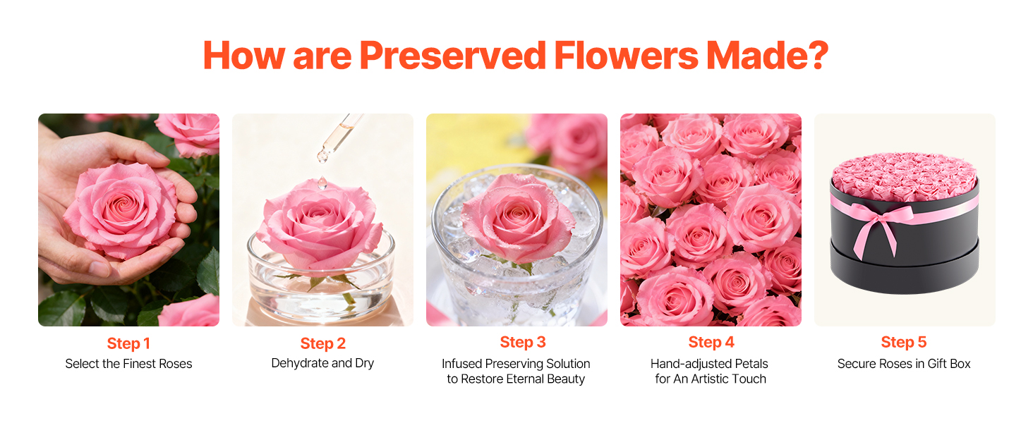 Vyrobené z pravých ruží pomocou profesionálnych konzervačných techník, každý navždy kvet je podopretý stabilným rámom, zostáva živý a elegantný pre dlhodobý pôžitok.