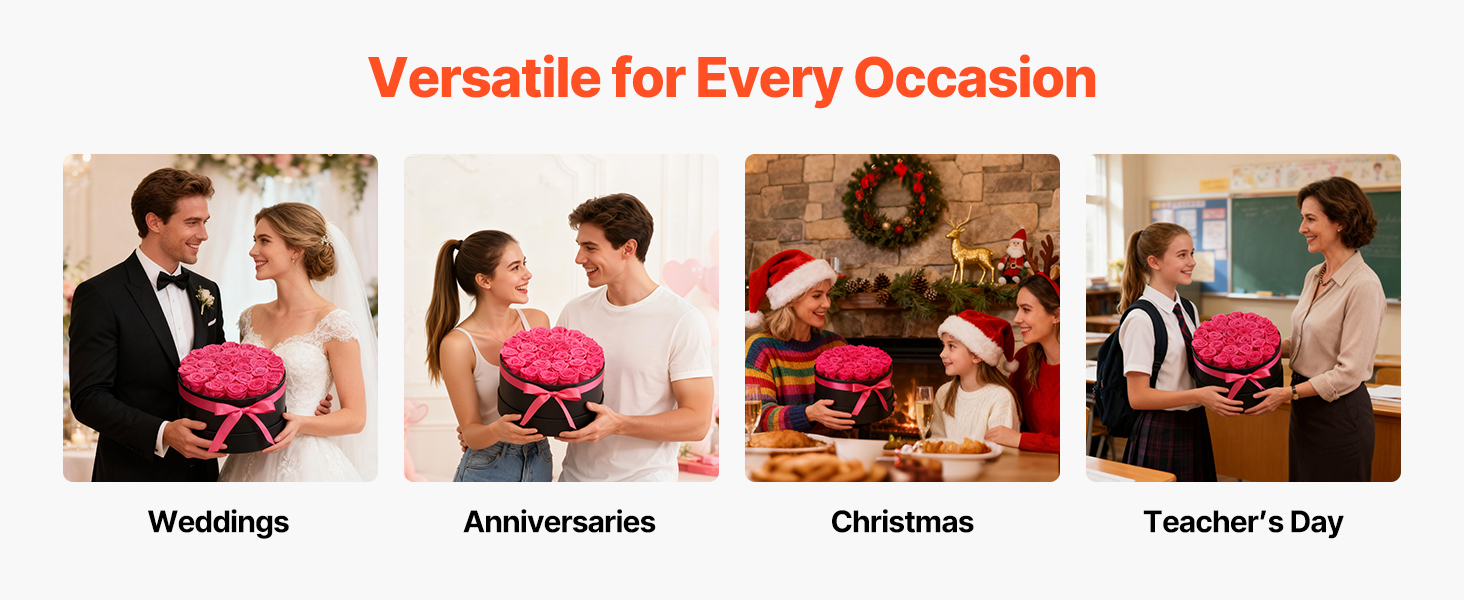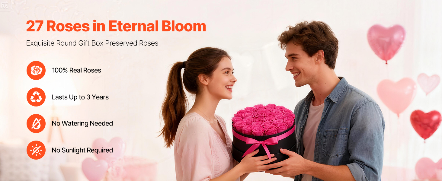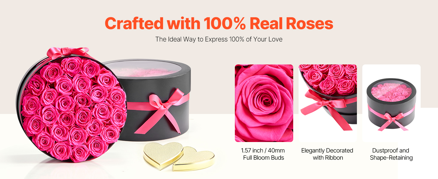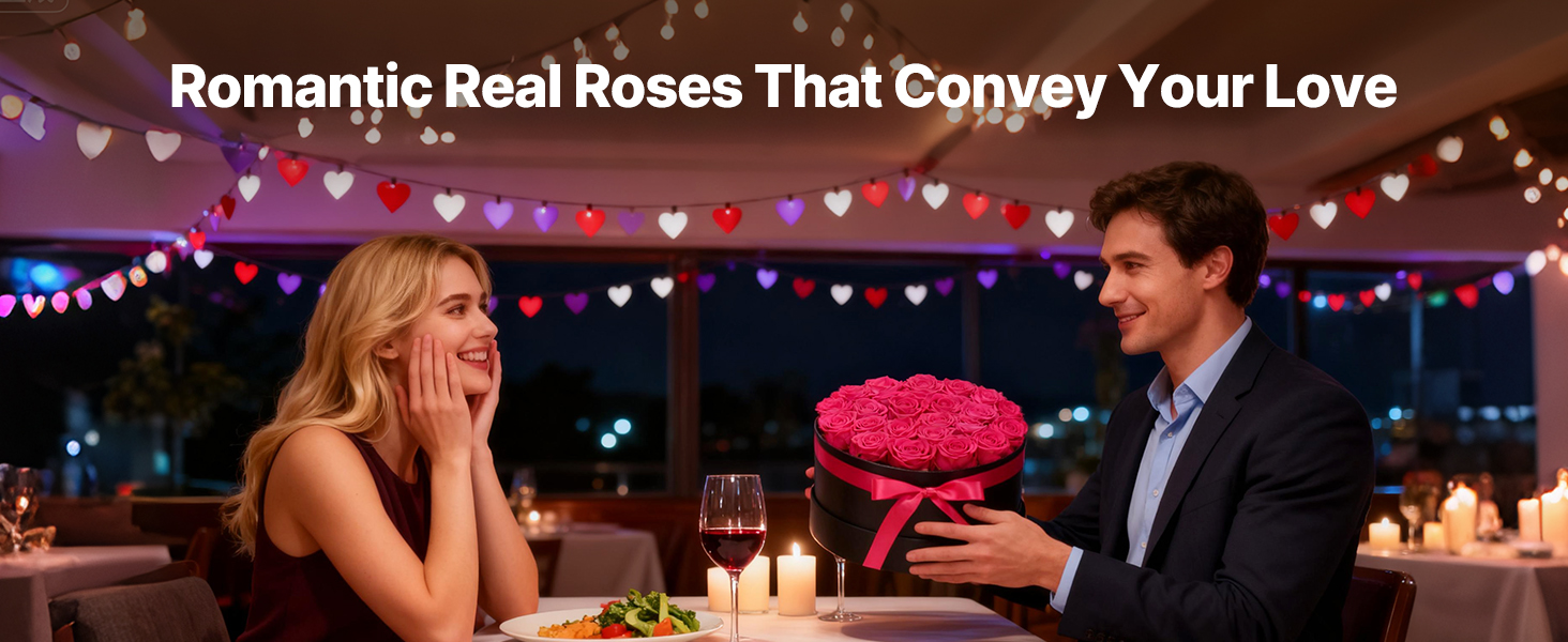 Tieto večné ruže sú vyrobené zo 100 % pravých ruží s plnými kvetmi a žiarivými farbami, nevyžadujú zalievanie ani slnečné svetlo a každú oslavu premenia na trvalú romantickú spomienku.