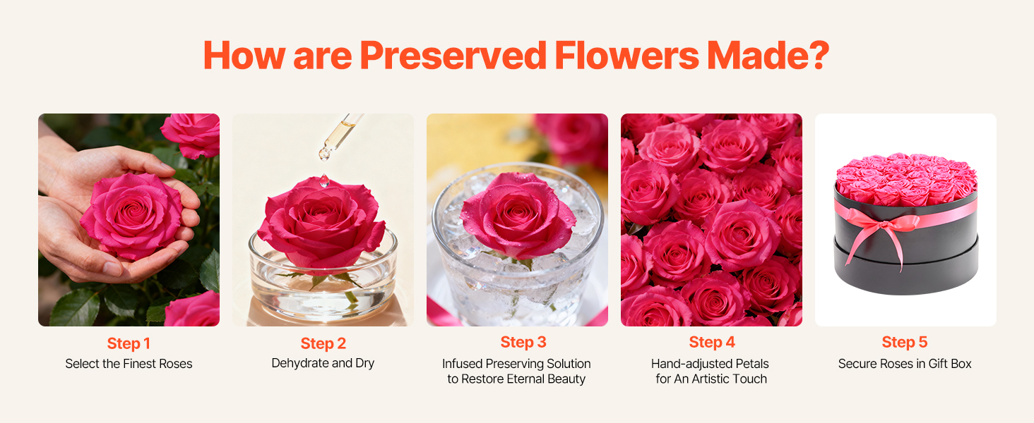 Vyrobené z pravých ruží pomocou profesionálnych konzervačných techník, každý navždy kvet je podopretý stabilným rámom, zostáva živý a elegantný pre dlhodobý pôžitok.