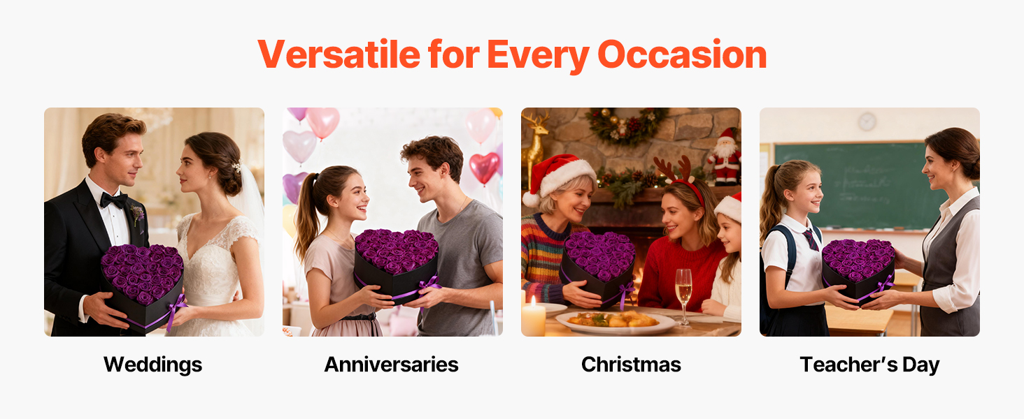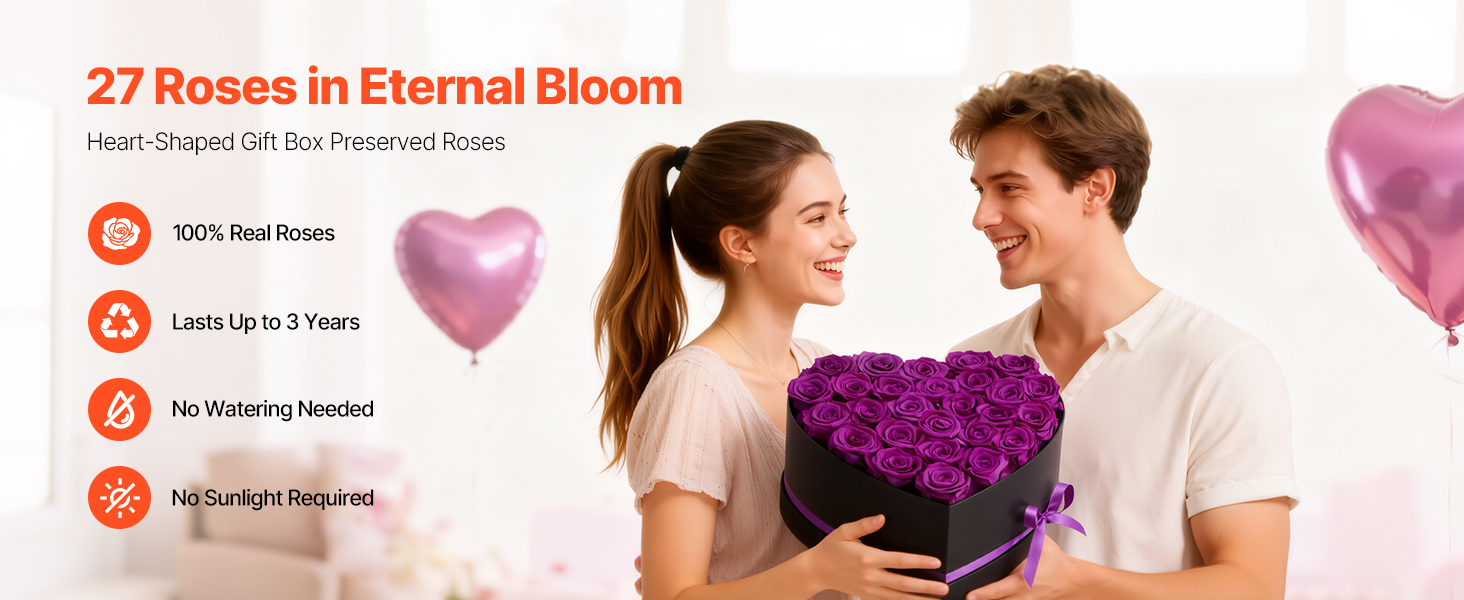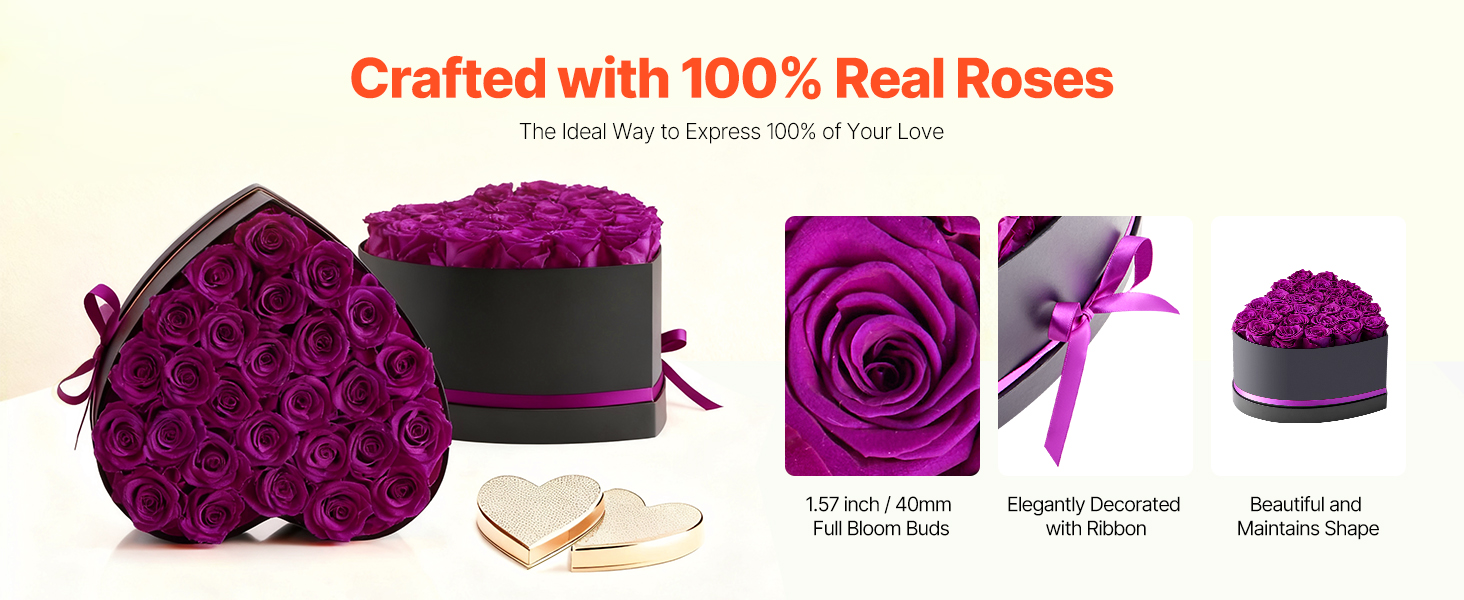 Tieto večné ruže sú vyrobené zo 100 % pravých ruží s plnými kvetmi a žiarivými farbami, nevyžadujú zalievanie ani slnečné svetlo a každú oslavu premenia na trvalú romantickú spomienku.