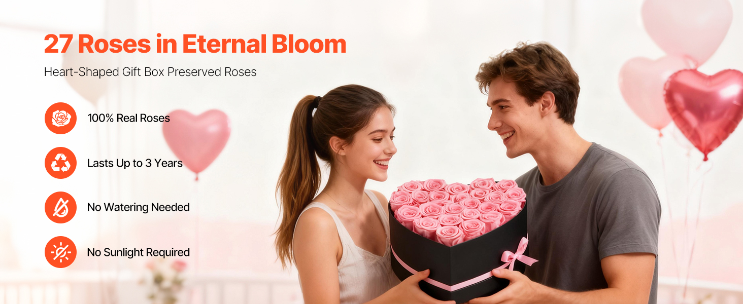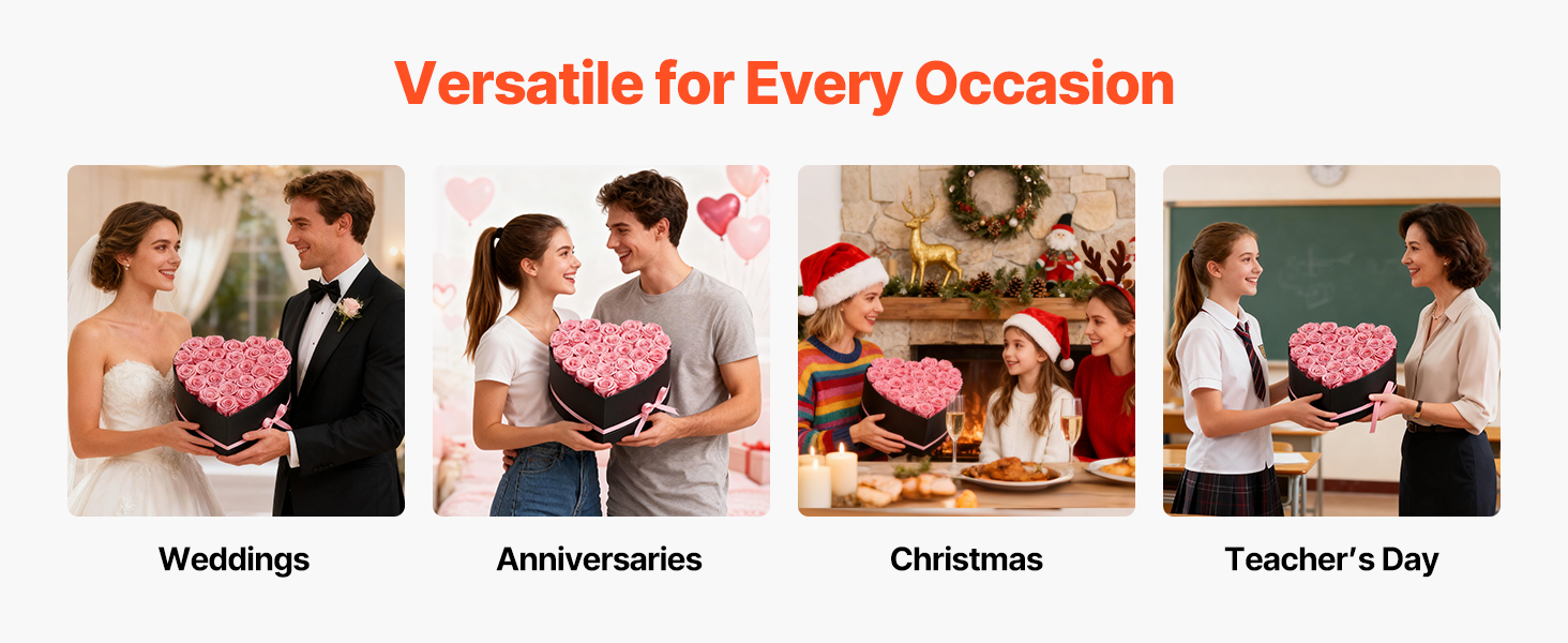 Tieto večné ruže sú vyrobené zo 100 % pravých ruží s plnými kvetmi a žiarivými farbami, nevyžadujú zalievanie ani slnečné svetlo a každú oslavu premenia na trvalú romantickú spomienku.