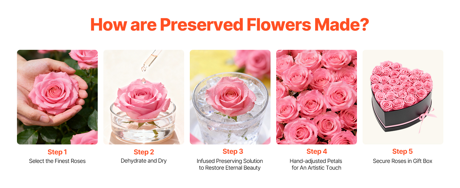Vyrobené z pravých ruží pomocou profesionálnych konzervačných techník, každý navždy kvet je podopretý stabilným rámom, zostáva živý a elegantný pre dlhodobý pôžitok.