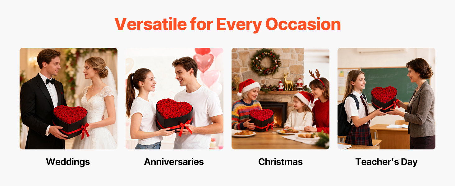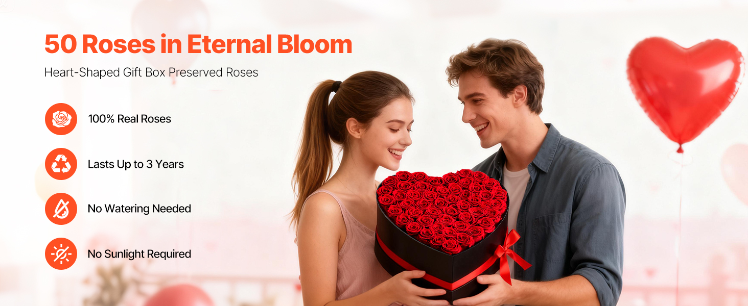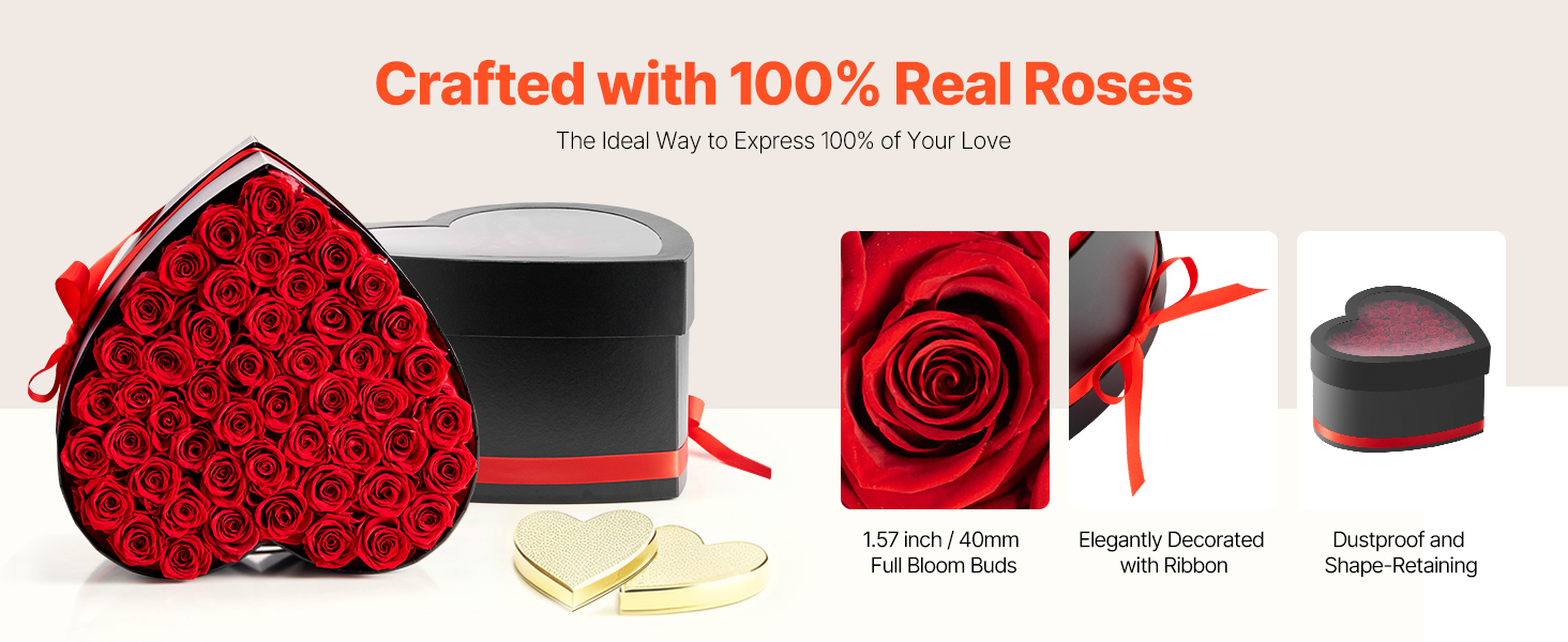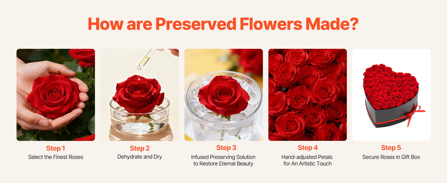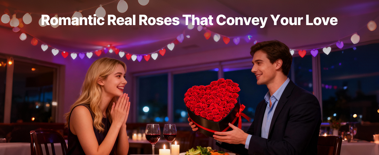 Tieto večne kvitnúce ruže sú vyrobené zo 100 % pravých ruží s plnými kvetmi a žiarivými farbami. Nevyžadujú žiadne zalievanie ani slnečné svetlo a premenia každú oslavu na trvalú romantickú spomienku.