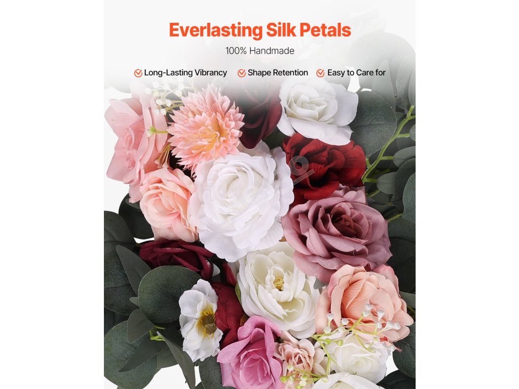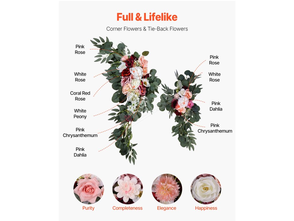 Táto súprava kvetov a závesov na svadobný oblúk obsahuje 2 trsy umelých kvetov, pričom každý kvet je plný a realistický, živý a odolný voči vyblednutiu. Sú neuveriteľne krásne a dajú sa používať dlhodobo alebo opakovane používať na budúce oslavy.
