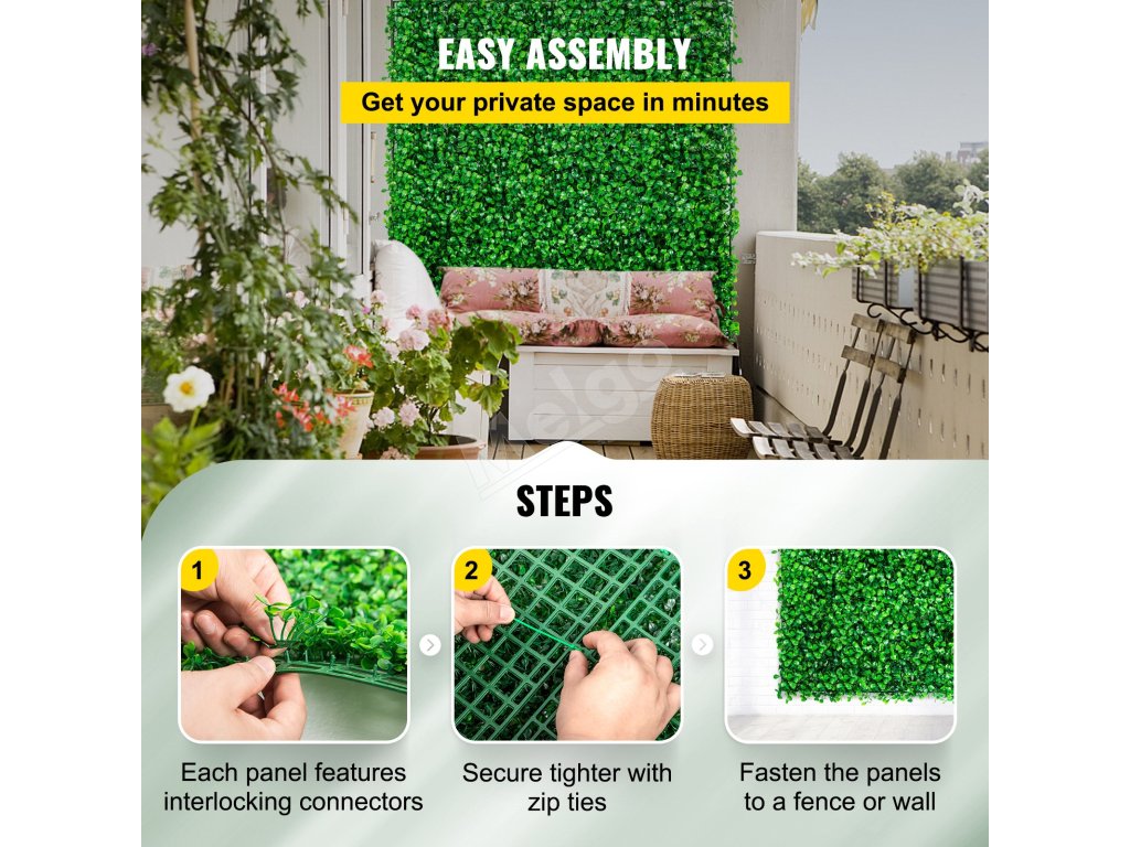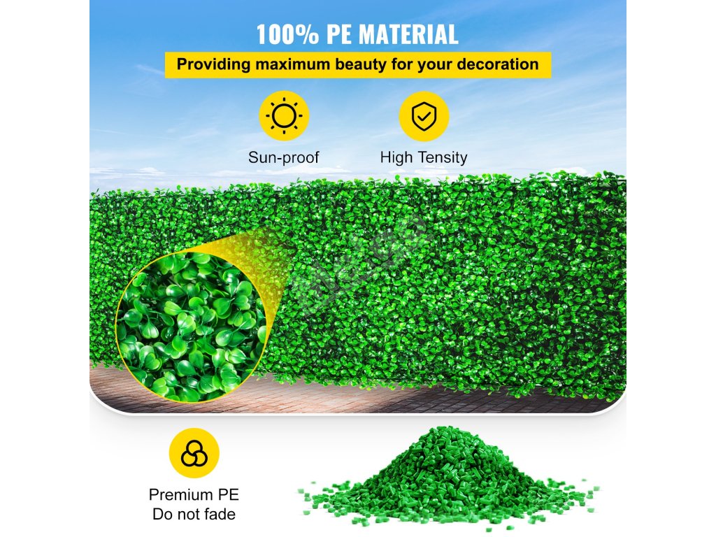 Náš umelý živý plot je vyrobený zo 100 % polyetylénu šetrného k životnému prostrediu, čo zaručuje dlhú životnosť bez vyblednutia.