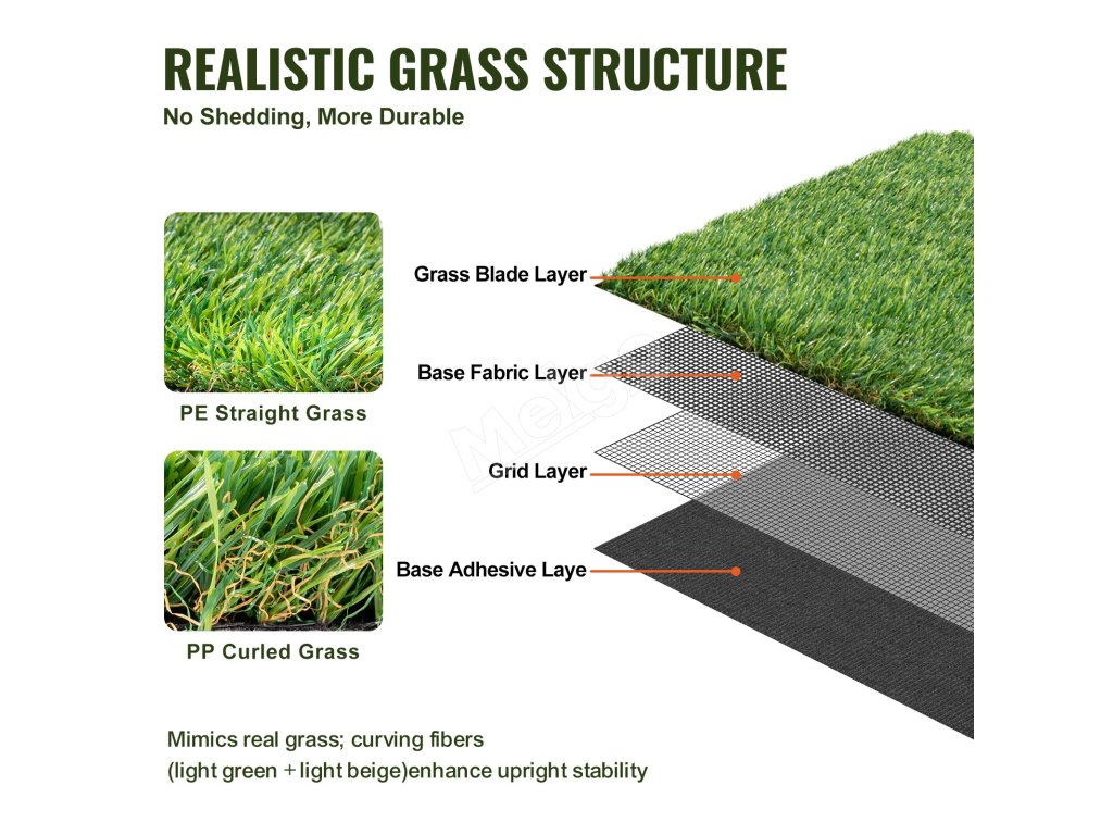 Trávne vlákna napodobňujú skutočné farby a tvary, zosilnená mriežka zvyšuje odolnosť proti opotrebovaniu a zabraňuje vylučovaniu. Spodné lepidlo zabezpečuje vlákna, čím sa predchádza ich ľahkému rozpadu. Stabilnejšie, menej sa deformujú, čím poskytujú lepší používateľský zážitok.