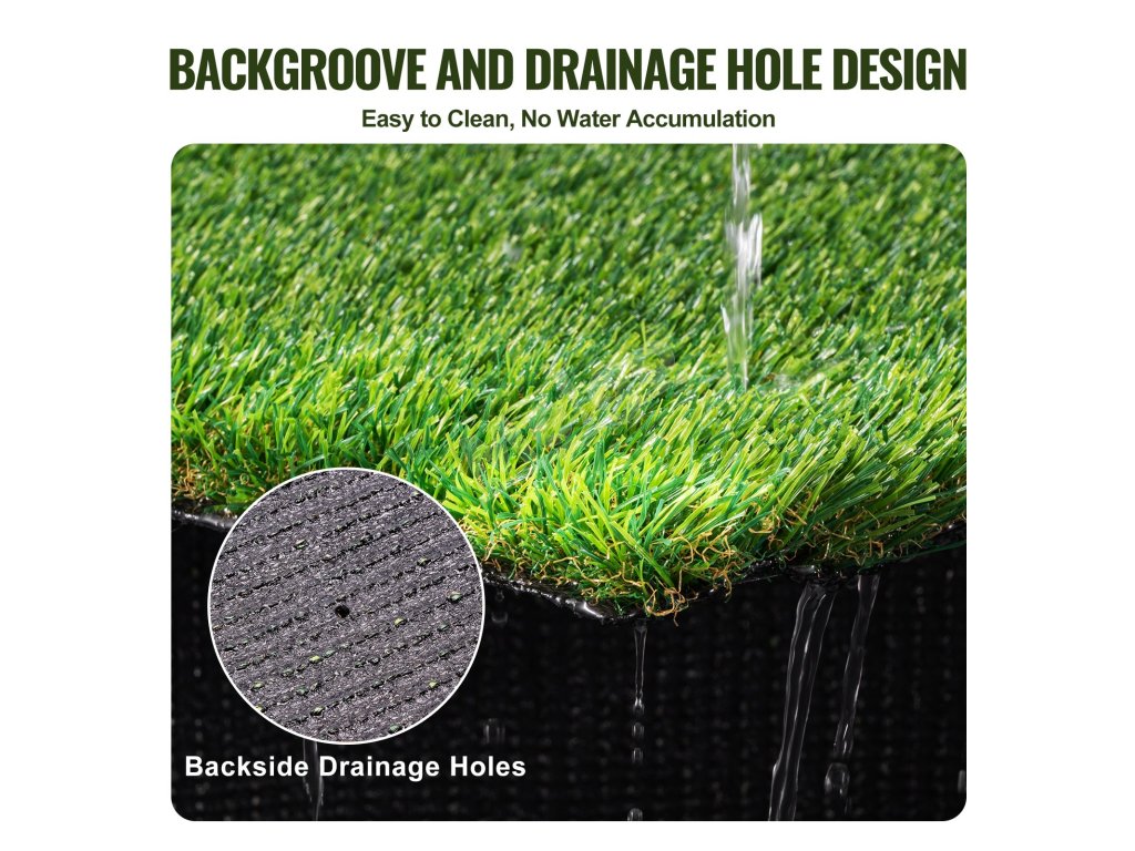 Zadná strana nášho trávnika je navrhnutá s drážkami a drenážnymi otvormi, čo uľahčuje čistenie a zabraňuje hromadeniu vody.