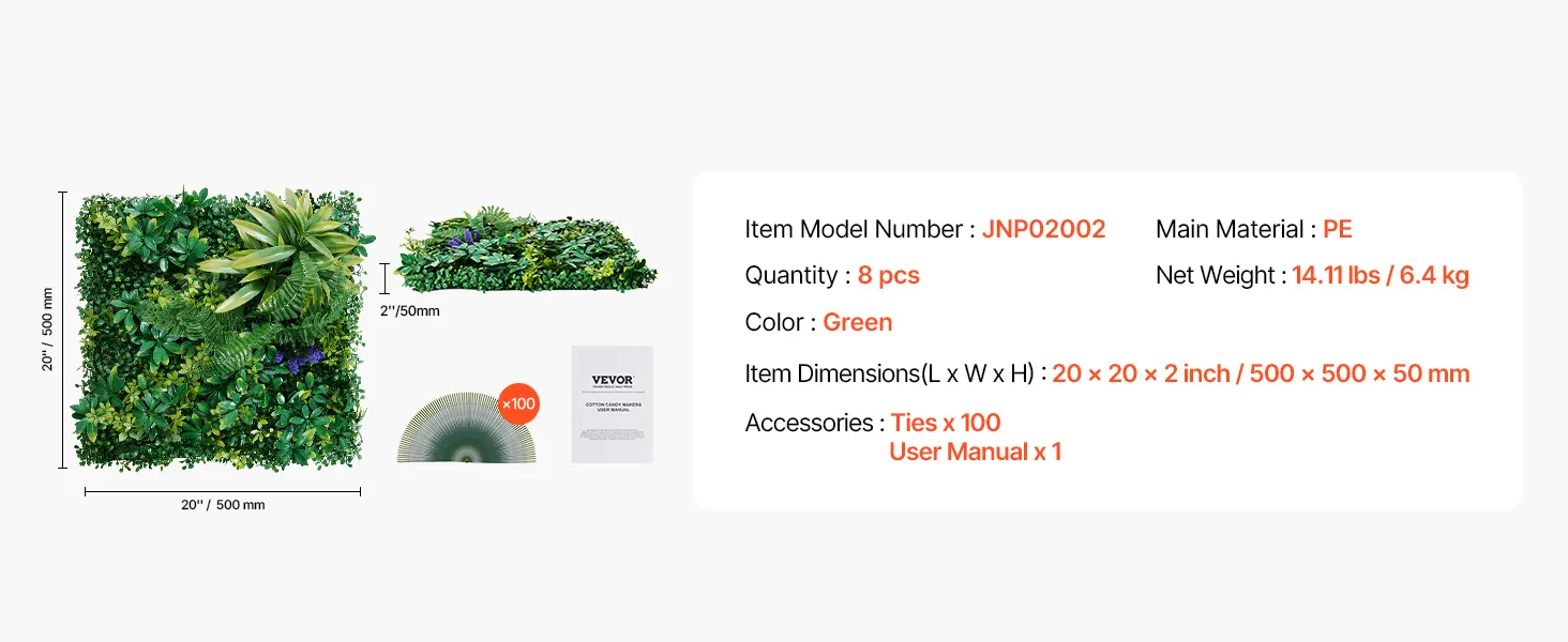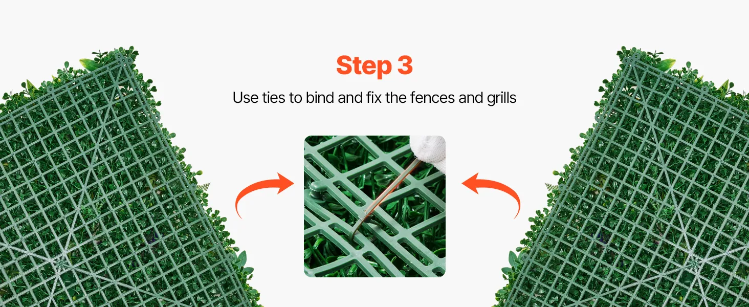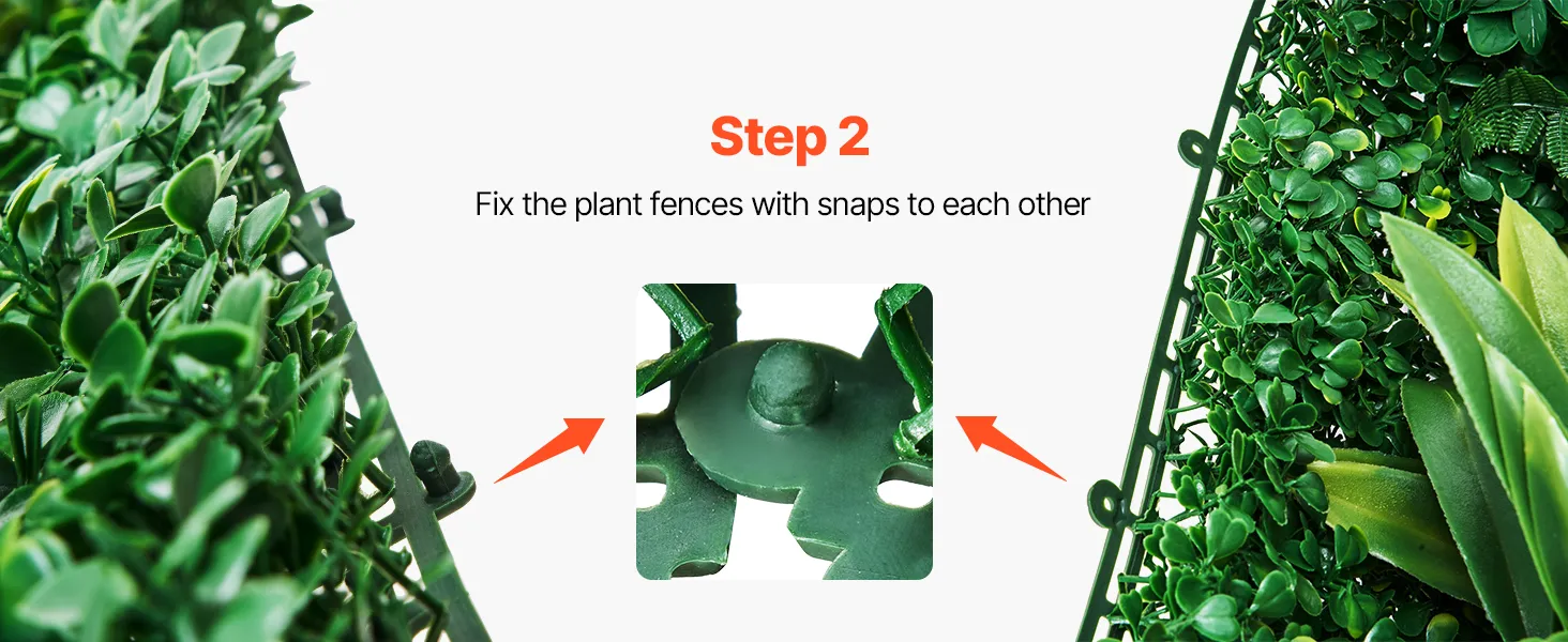 Táto umelá rastlinná stena, vyrobená z hustého a prirodzene vyzerajúceho PE materiálu, sa ľahko montuje pomocou jednoduchých spojovacích prvkov. Súčasťou balenia sú aj zipsy na zaistenie bezpečného upevnenia. Podklad s vysokou hustotou a bujnou vegetáciou ponúka skvelú ochranu vášho osobného súkromia.