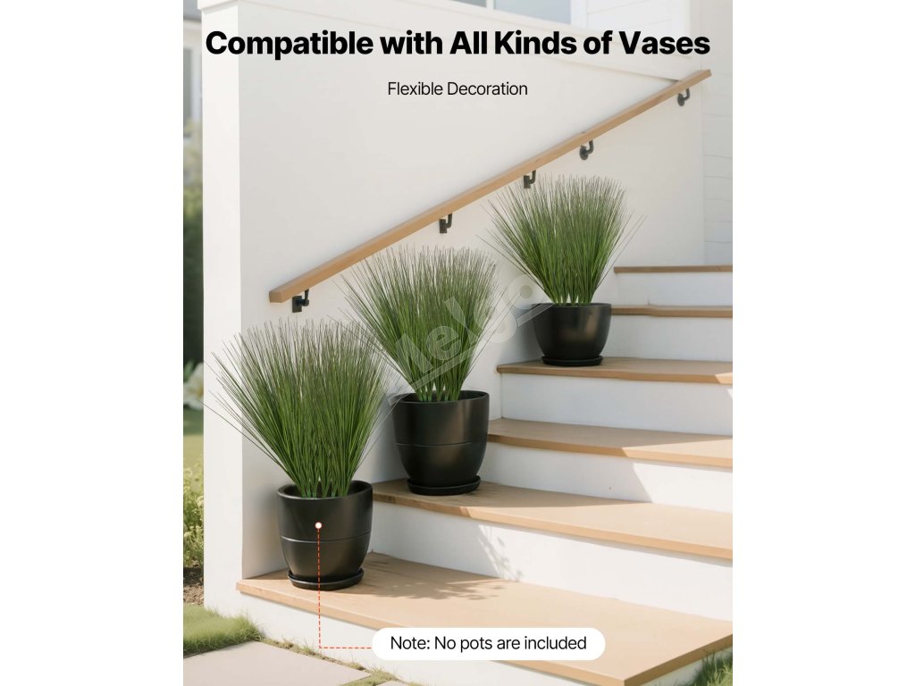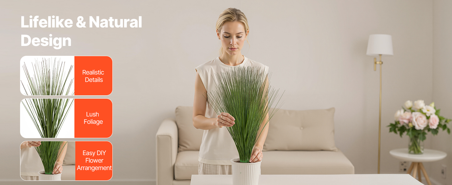 Vďaka realistickej textúre trávy a hustému vrstvenému lístiu sa umelá trávnatá zeleň dodáva bez kvetináčov na flexibilné usporiadanie do vázy. Ideálne sa hodí do obývacích izieb, na verandy alebo balkóny a pozdvihne váš dekor.