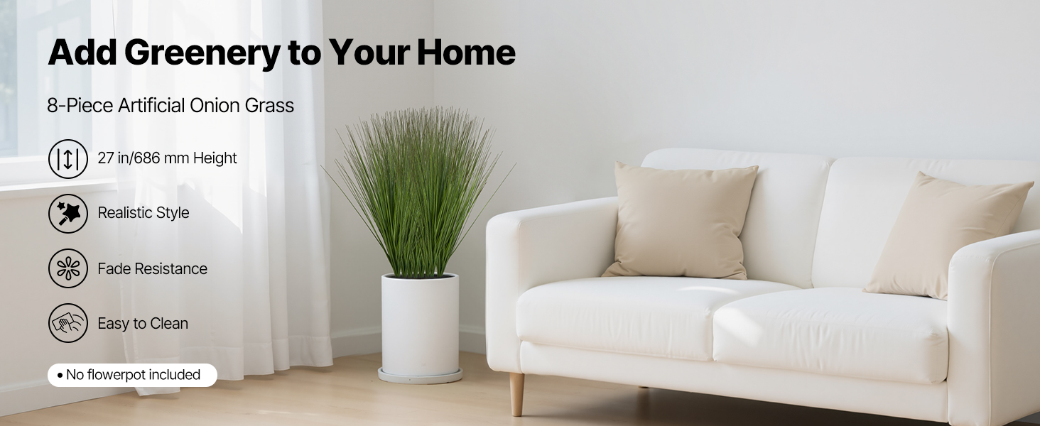 Umelá cibuľová tráva má realistický vzhľad a realistickú štruktúru. Naša umelá tráva vytvára prirodzenú atmosféru blízku skutočným rastlinám. Ľahko sa udržiava a je vizuálne príťažlivá, dodá vášmu priestoru trvalú zeleň.