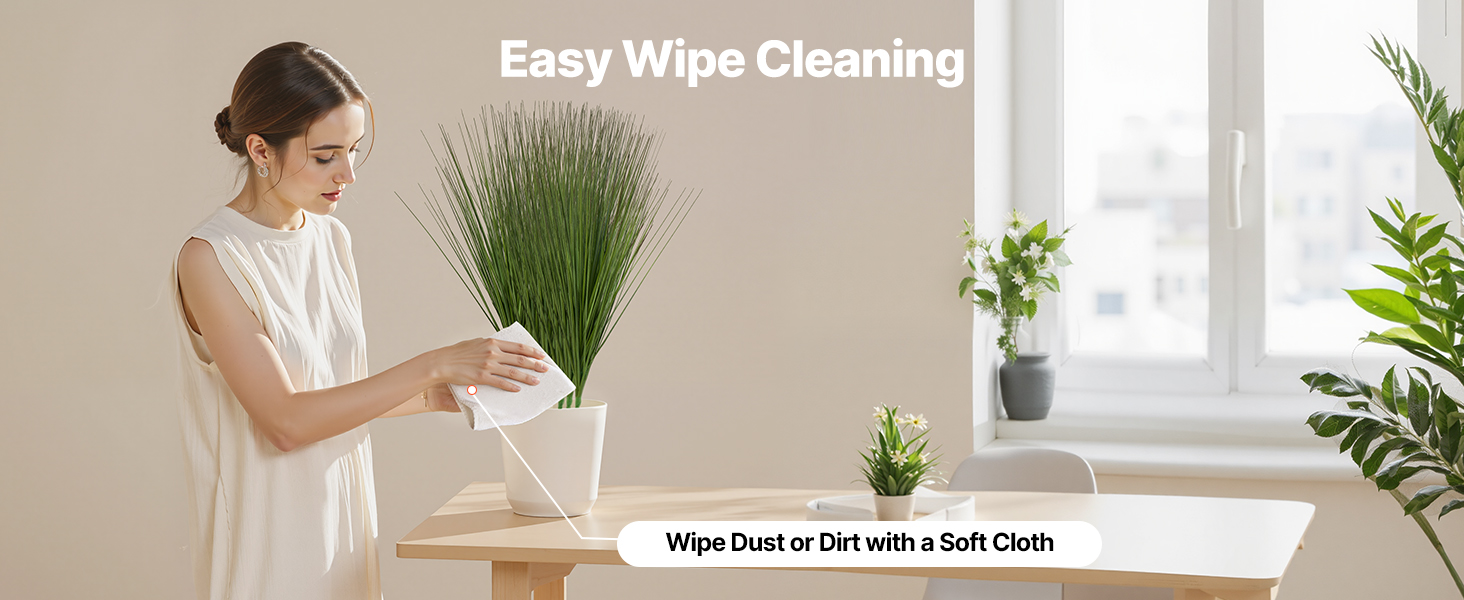 Na očistenie od prachu a každodenných škvŕn ju stačí utrieť mäkkou handričkou. Dekoratívna umelá tráva zostáva sviežo vyzerajúca s minimálnym úsilím, čo prináša rýchlu a bezproblémovú bežnú údržbu.