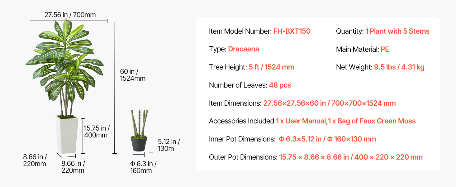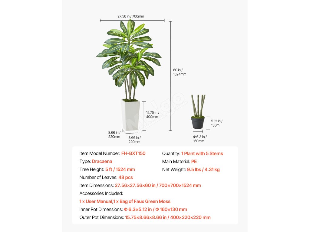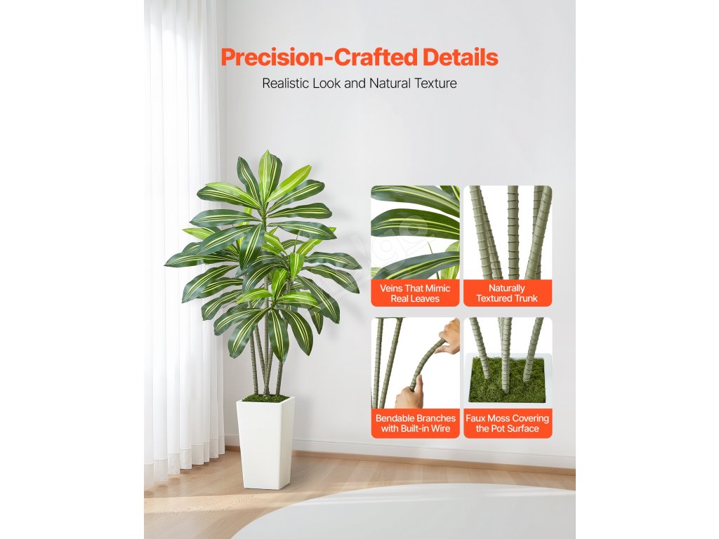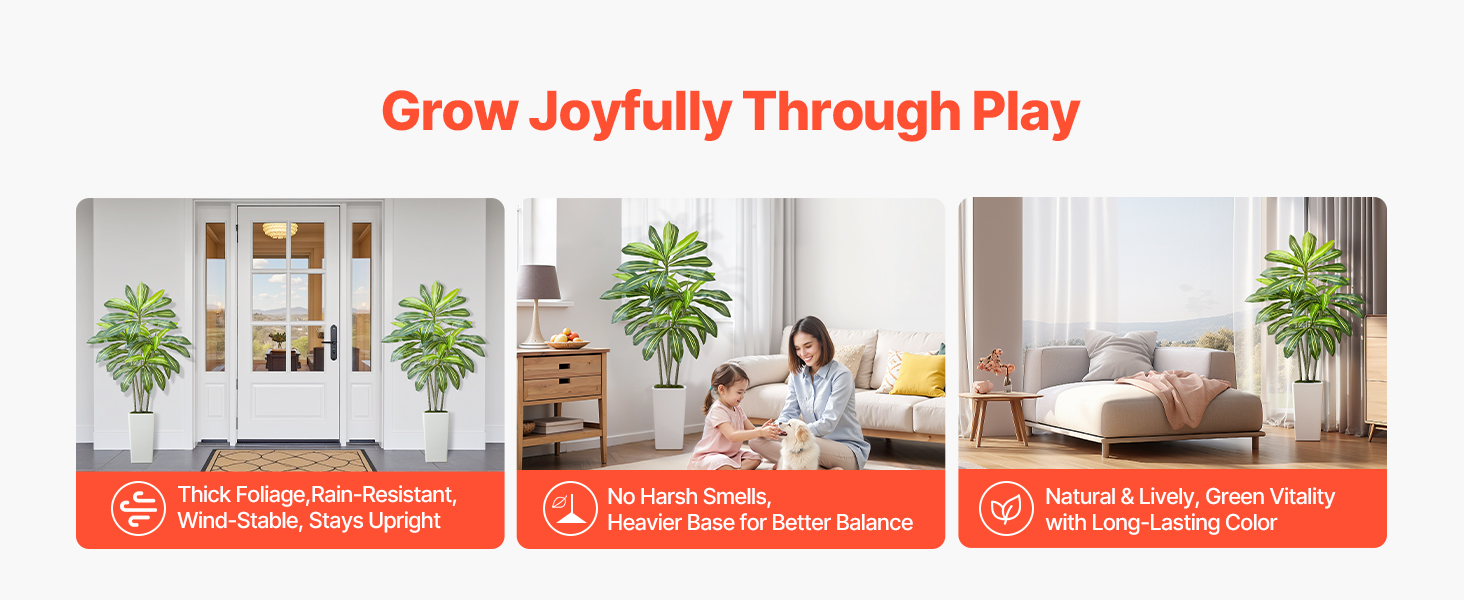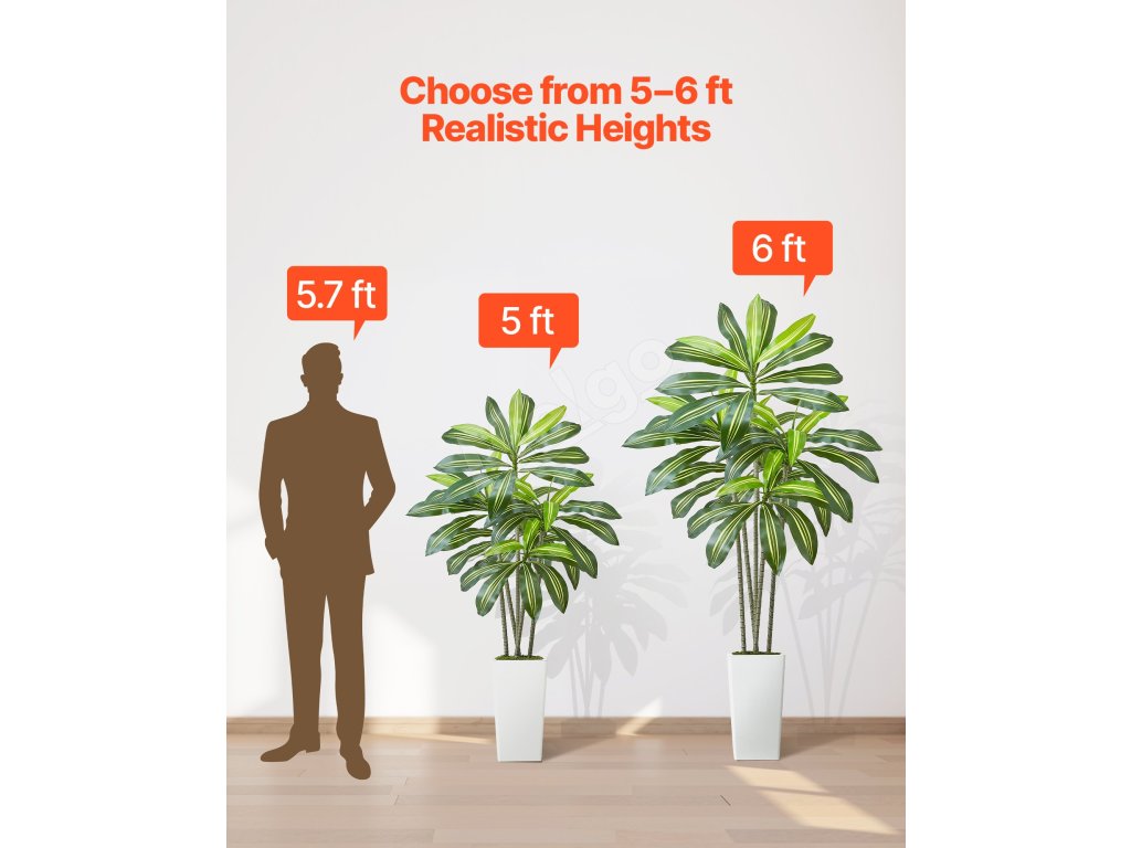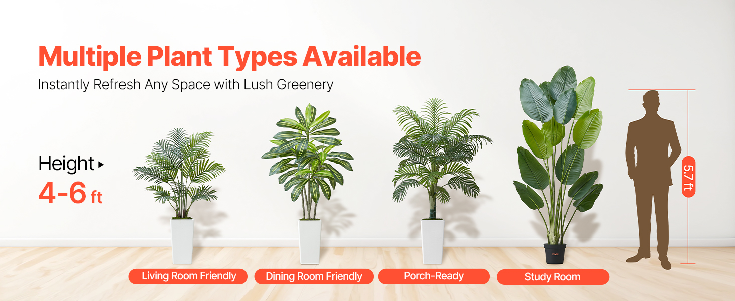 Obsahuje 4 typy tropických rastlín: areková palma s hrubým kmeňom, dracéna, areková palma a rajský vták. Rozsah 4-6 stôp výšky s realistickými PE listami. Vodotesné, vhodné na slabé osvetlenie, ľahko sa čistia a sú bezúdržbové.