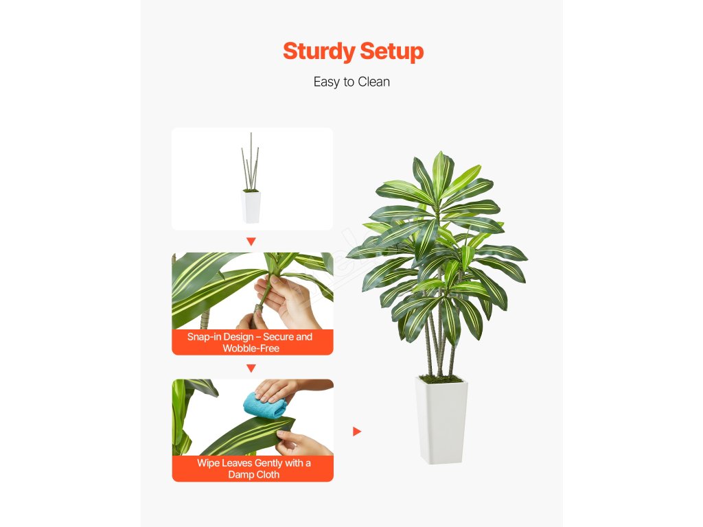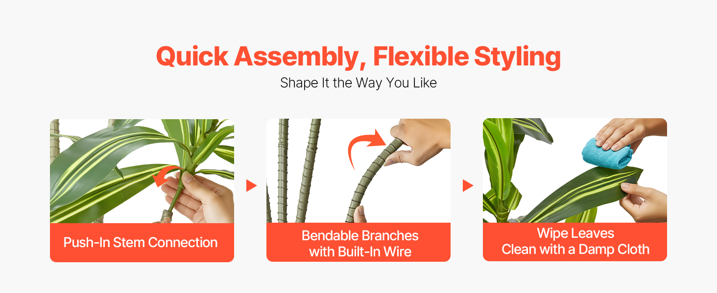 Vďaka zasúvacím spojom je montáž stonky jednoduchá a bezpečná. Nastaviteľné vetvy umožňujú meniť tvar umelých izbových rastlín pre dosiahnutie prirodzenejších kriviek a realistického vzhľadu.