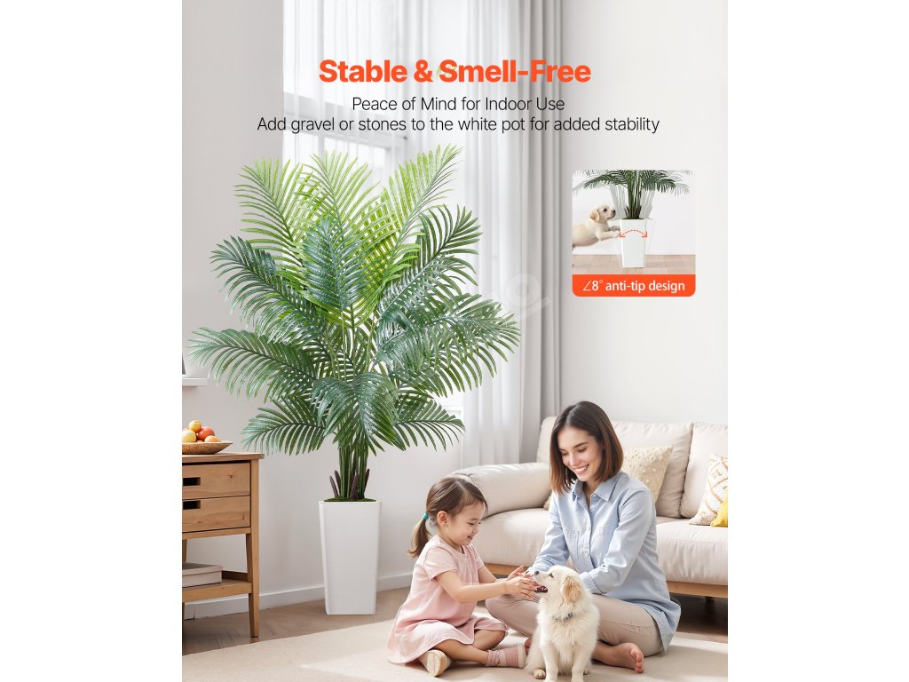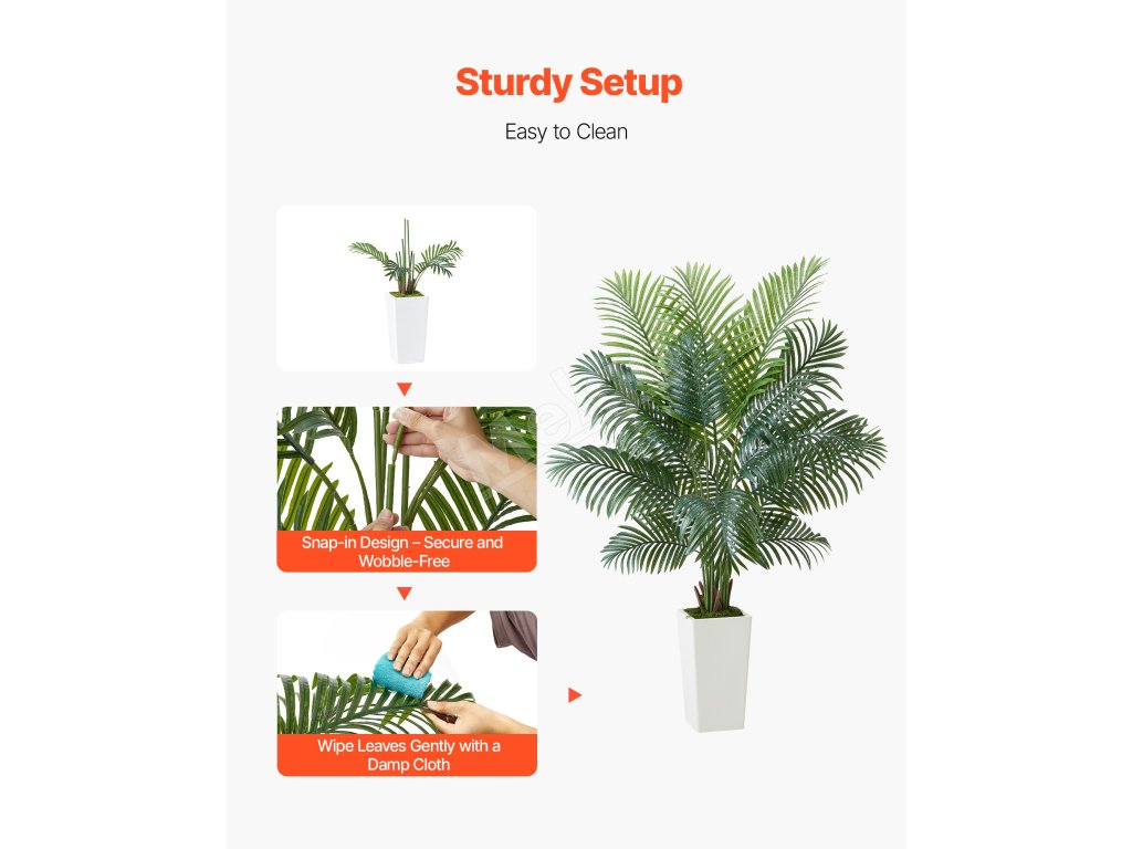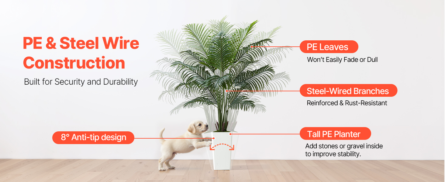 Tieto rastliny sú vyrobené z PE listov a vnútorného oceľového drôtu, vďaka čomu sú odolné voči vyblednutiu a ohýbaniu. Robustný kvetináč pomáha predchádzať prevráteniu a ponúka spoľahlivosť aj dlhodobé používanie.