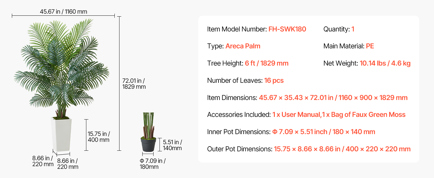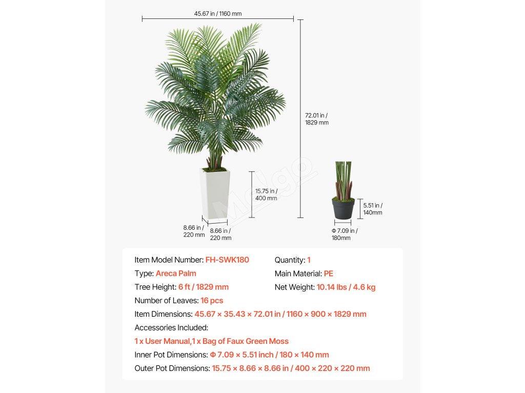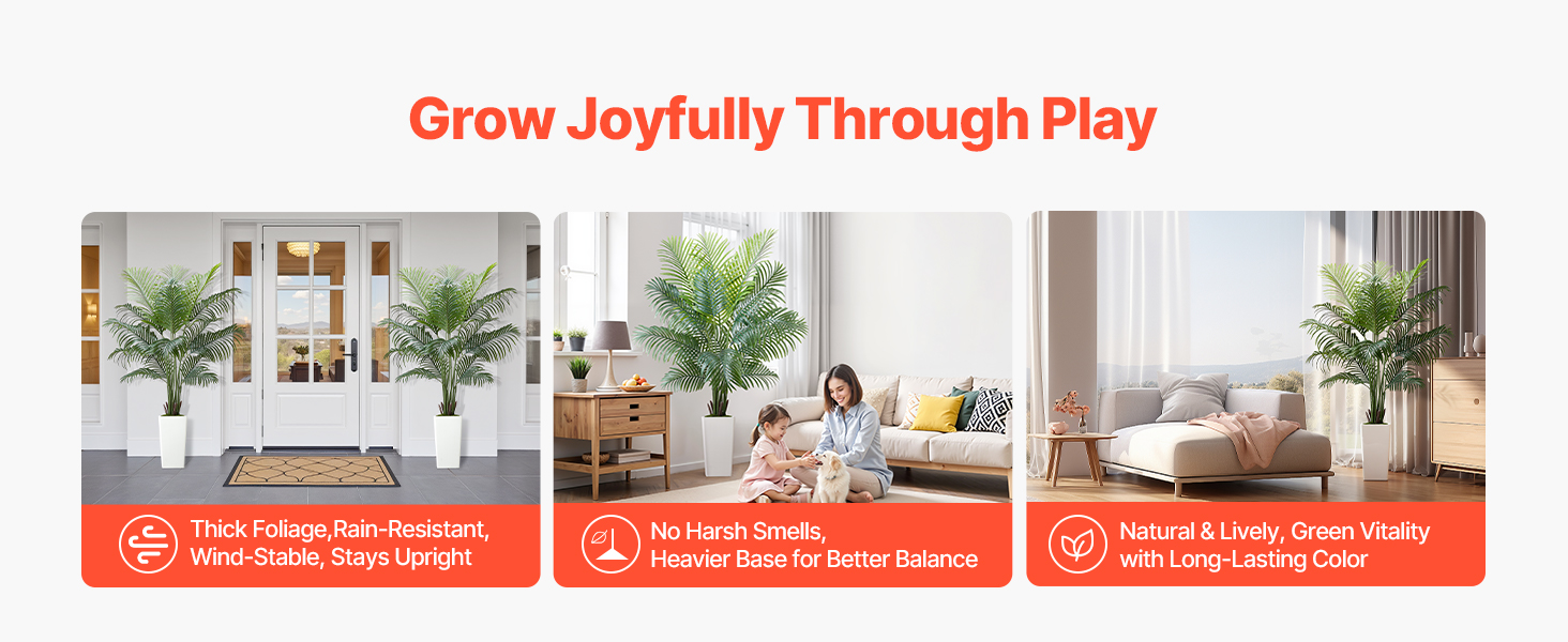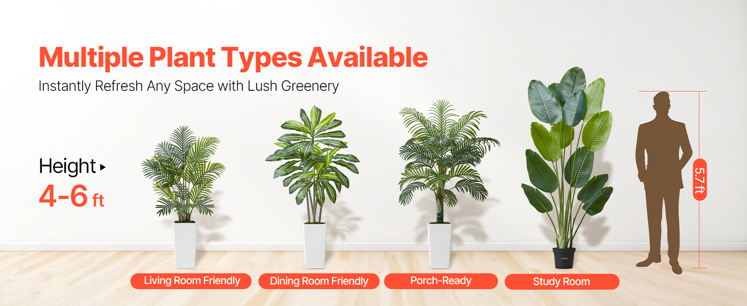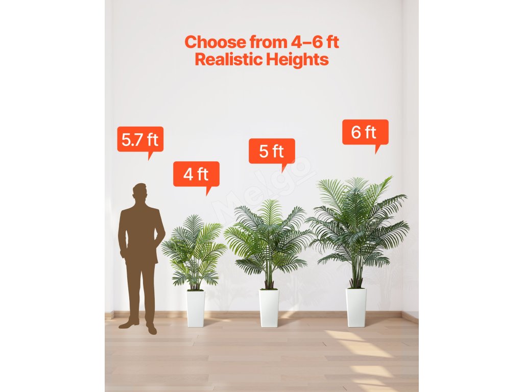 Obsahuje 4 typy tropických rastlín: areková palma s hrubým kmeňom, dracéna, areková palma a rajský vták. Rozsah 4-6 stôp výšky s realistickými PE listami. Vodotesné, vhodné na slabé osvetlenie, ľahko sa čistia a sú bezúdržbové.