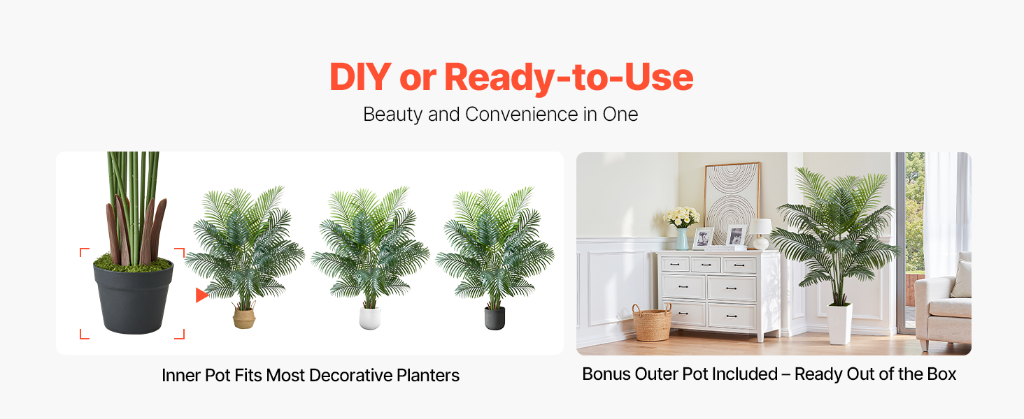 Dodáva sa s minimalistickým jednofarebným kvetináčom, ktorý je pripravený na použitie po vybalení z krabice. Dobre sa kombinuje s väčšinou interiérových štýlov, vďaka čomu môžete svoj domov ľahko obohatiť o tropickú zeleň.
