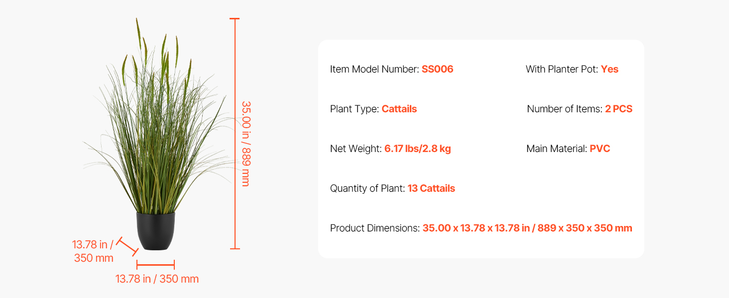Naša umelá trávnatá rastlina v kvetináči je vyrobená z robustného materiálu PVC, takže nevädne ani sa ľahko neohne. Opakovane použiteľná so vzpriamenými listami, ktoré si zachovávajú prirodzený vzhľad a trvalú krásu.