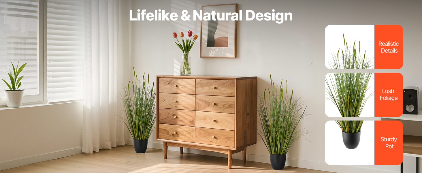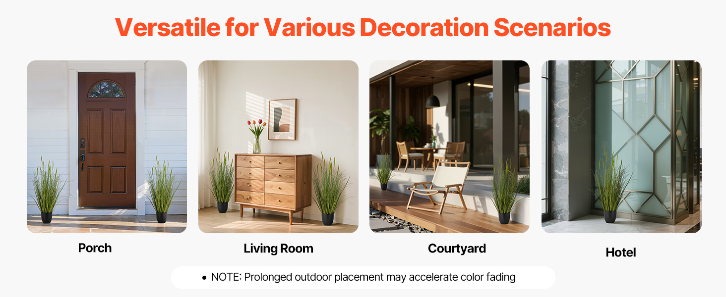 Táto realistická rastlina trávy sa hodí na použitie v interiéri aj exteriéri. Či už ju umiestnite na verande, v obývacej izbe, záhrade alebo hotelovej hale, okamžite zvýrazní zeleň a atmosféru každého priestoru.