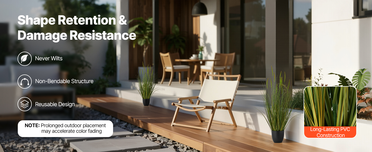 Táto umelá trávnatá zeleň s realistickými kvetinovými detailmi a hustými vrstvenými listami sa dodáva s robustným PP kvetináčom, ktorý je ľahký a ľahko prenosný. Ideálna do obývacích izieb, na verandy alebo balkóny, kde pozdvihne váš dekor.