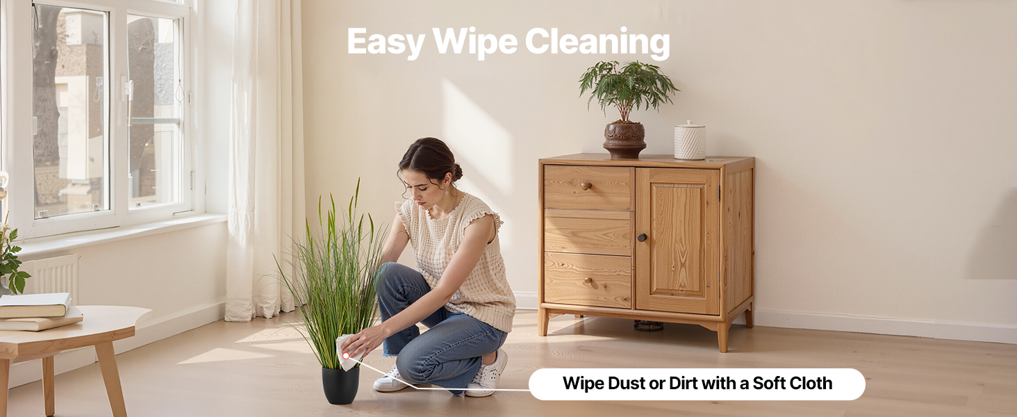 Na očistenie od prachu a každodenných škvŕn ju stačí utrieť mäkkou handričkou. Dekoratívna umelá tráva zostáva sviežo vyzerajúca s minimálnym úsilím, čo prináša rýchlu a bezproblémovú bežnú údržbu.