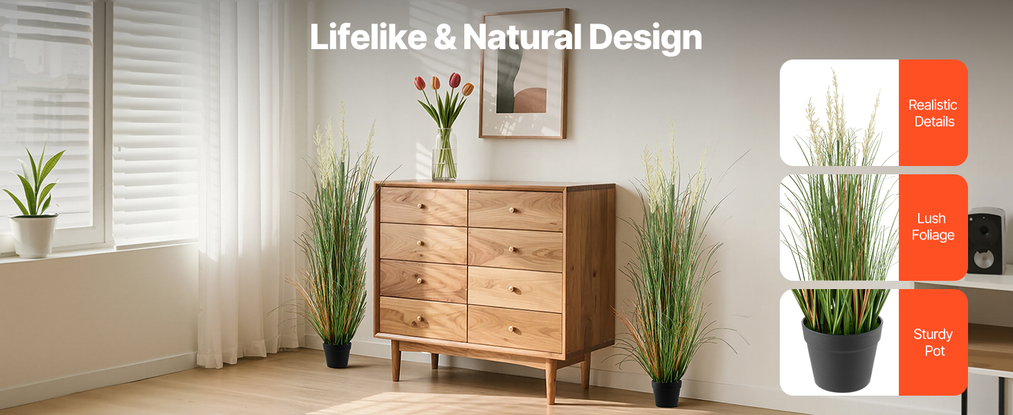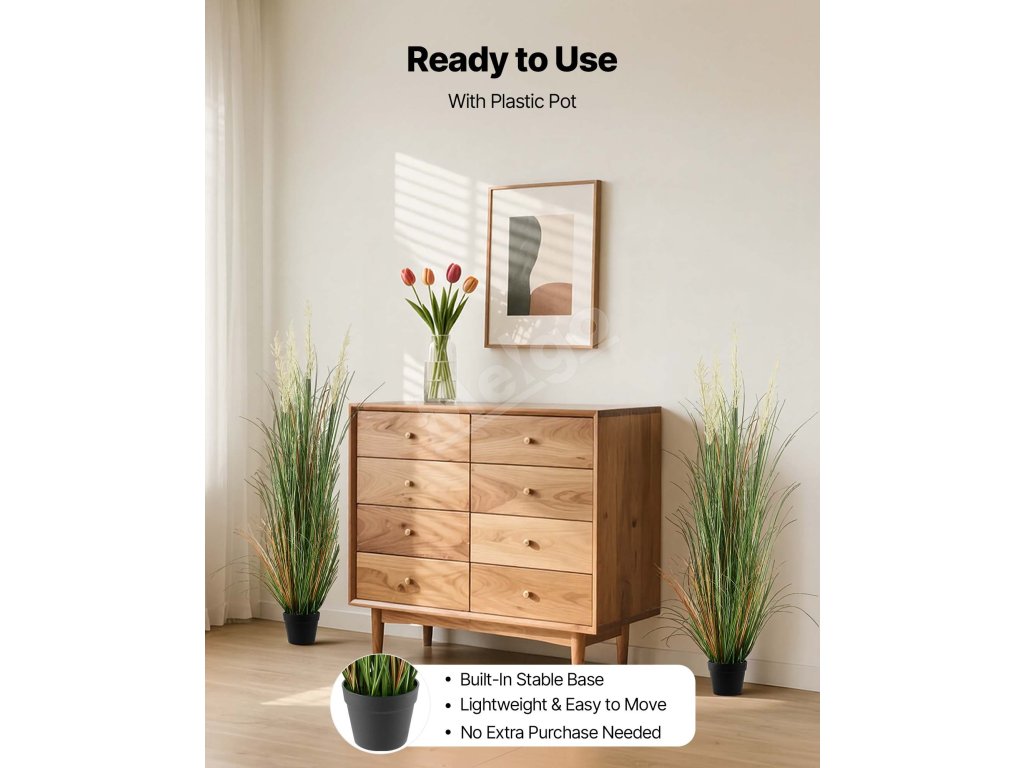Táto umelá trávnatá zeleň s realistickými kvetinovými detailmi a hustými vrstvenými listami sa dodáva s robustným PP kvetináčom, ktorý je ľahký a ľahko prenosný. Ideálna do obývacích izieb, na verandy alebo balkóny, kde pozdvihne váš dekor.