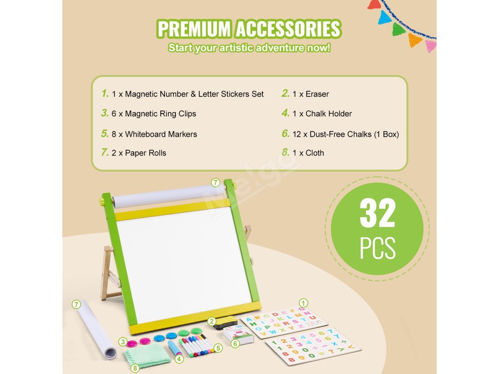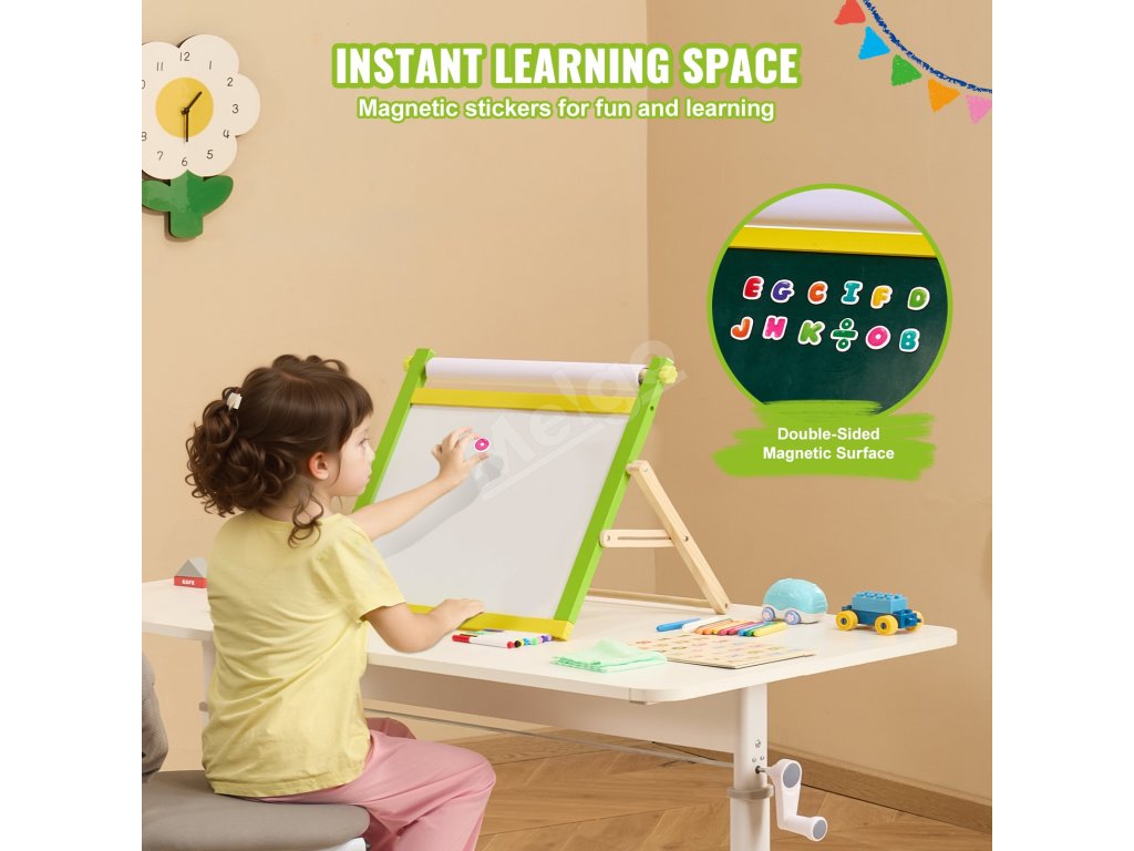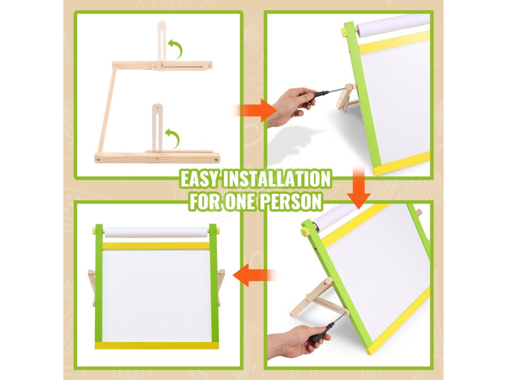 Tento detský výtvarný stojan dáva vášmu dieťaťu na výber medzi kriedou a bielou tabuľou, čím podnecuje jeho kreativitu s obľúbeným povrchom. Obojstranný dizajn vkladá dve možnosti kreslenia do jedného stojana, ktorý šetrí miesto, takže je skvelou voľbou pre domáce aj školské zariadenia.