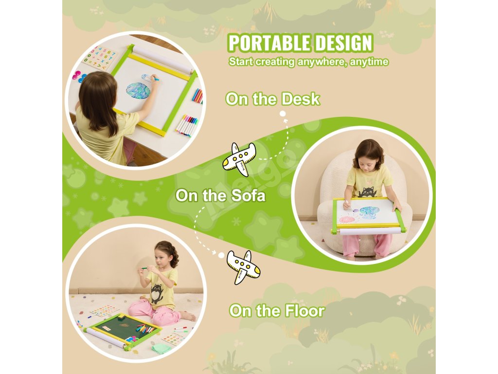 Či už je to na stole, podlahe, gauči, alebo dokonca vonku, tento umelecký stojan umožňuje vám a vášmu dieťaťu spoločne tvoriť umenie v akomkoľvek prostredí. Je to zábavný spôsob, ako si spestriť rutinu a užiť si kvalitný rodinný čas.