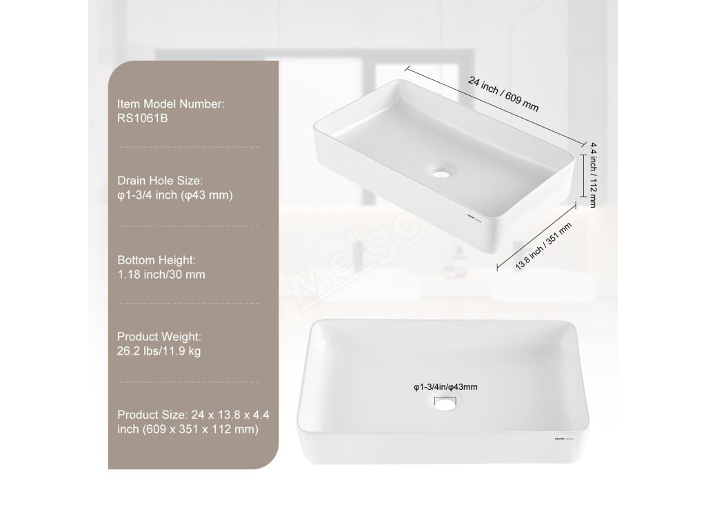 Obdĺžnikové umývadlo na dosku, keramické, biele, 24"×13.8", do kúpeľne