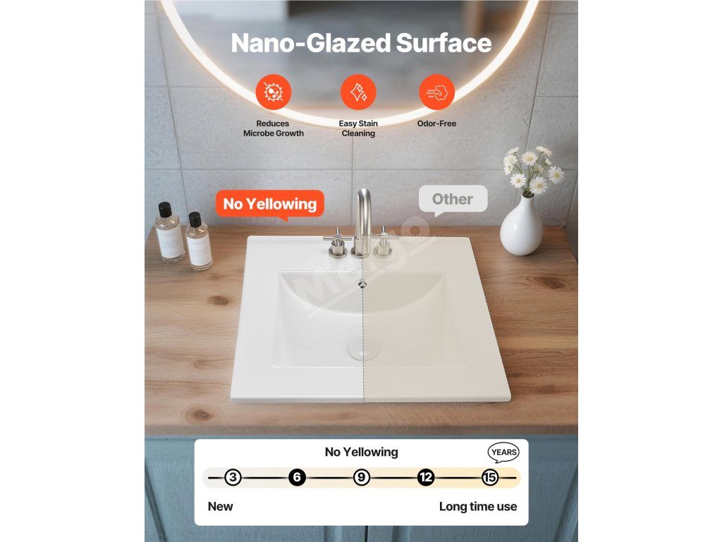 Toto keramické kúpeľňové umývadlo, vypálené pri vysokých teplotách pre dosiahnutie odolnosti, je potiahnuté vrstvou nano glazúry, ktorá odoláva škvrnám od vody, mydlovým vodám a poškriabaniu. Časom zostáva žiarivé a hladké, takže každodenné čistenie je rýchle a bez námahy.