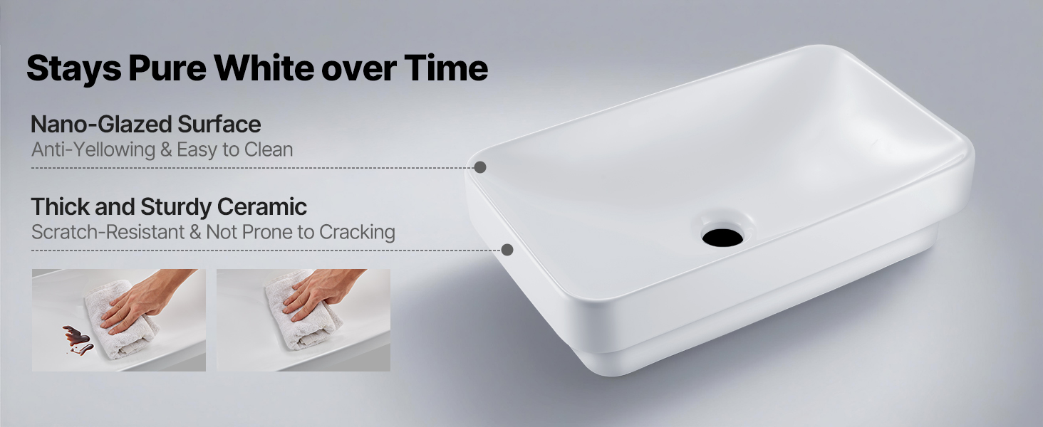 Toto keramické kúpeľňové umývadlo, vypálené pri vysokých teplotách pre dosiahnutie odolnosti, je potiahnuté vrstvou nano glazúry, ktorá odoláva škvrnám od vody, mydlovým vodám a poškriabaniu. Časom zostáva žiarivé a hladké, takže každodenné čistenie je rýchle a bez námahy.
