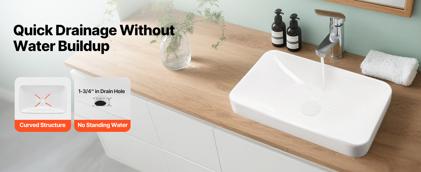 Kúpeľňové polozapustené umývadlo, navrhnuté so zakriveným dnom a širokým odtokovým otvorom, podporuje plynulý odtok vody bez toho, aby sa v ňom voda hromadila. Odoláva zápachu a udržiava umývadlo čisté a suché, čím prináša pohodlnejšie a efektívnejšie umývanie.