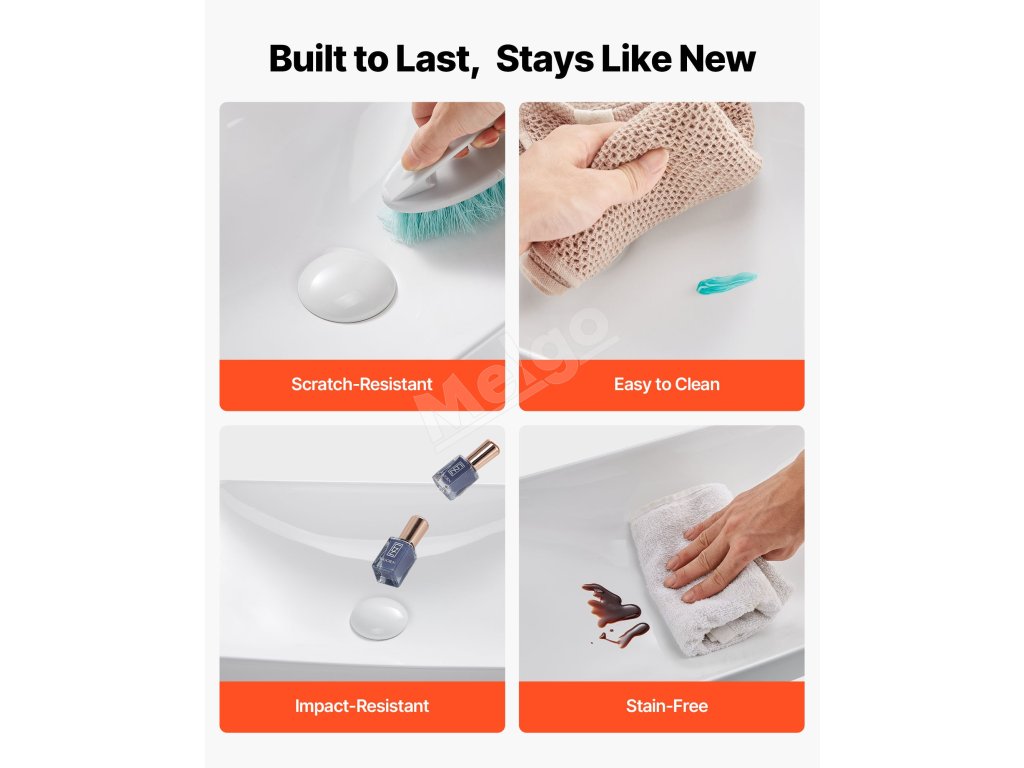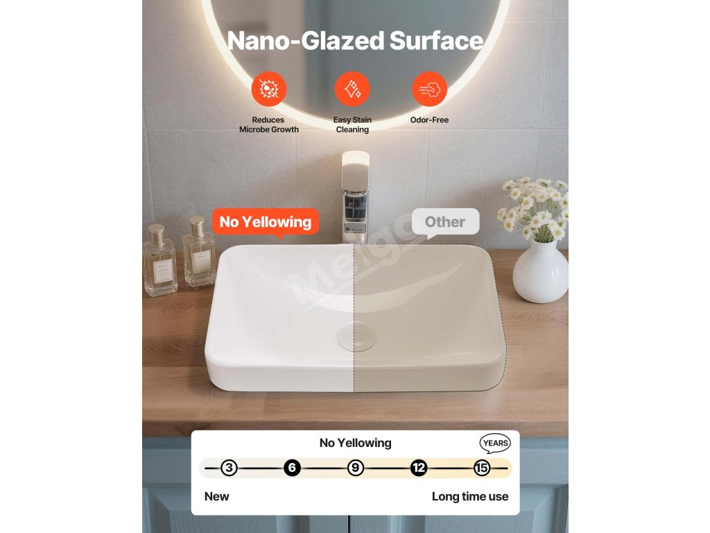 Toto keramické kúpeľňové umývadlo, vypálené pri vysokých teplotách pre dosiahnutie odolnosti, je potiahnuté vrstvou nano glazúry, ktorá odoláva škvrnám od vody, mydlovým vodám a poškriabaniu. Časom zostáva žiarivé a hladké, takže každodenné čistenie je rýchle a bez námahy.