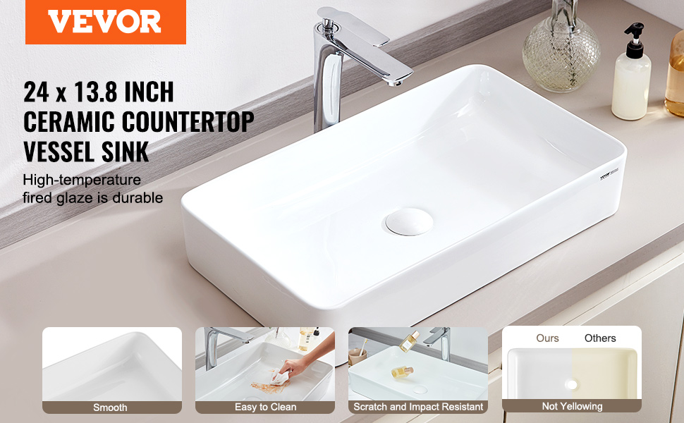 Toto umývadlo na nádoby je vyrobené z vysokokvalitnej keramickej hliny, ktorá bola úplne vitrifikovaná vypálením pri vysokej teplote, vďaka čomu má tvrdú štruktúru, ktorá časom nežltne. Povrch je hladký a jemný s nízkou nasiakavosťou, vďaka čomu je odolný voči škvrnám a ľahko sa udržiava.