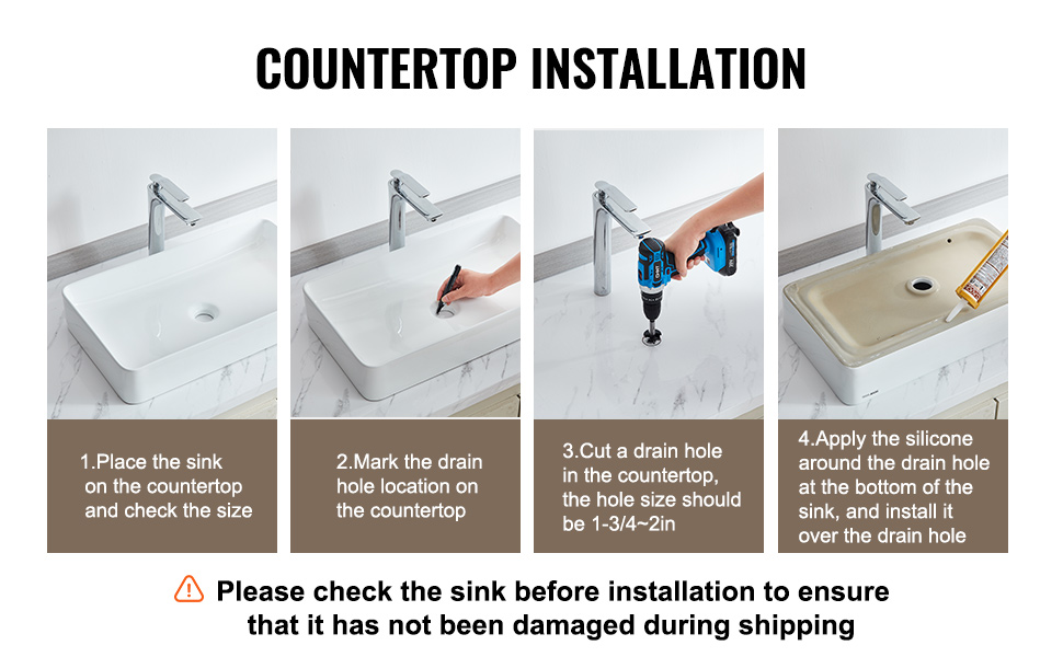 Umývadlo je obklopené penovým polstrovaním, ktoré zabraňuje poškodeniu počas prepravy. Pred inštaláciou drezu ho skontrolujte, aby ste sa uistili, že sa pri preprave nepoškodil. Pri jednoduchej inštalácii v 4 krokoch postupujte podľa pokynov v návode.