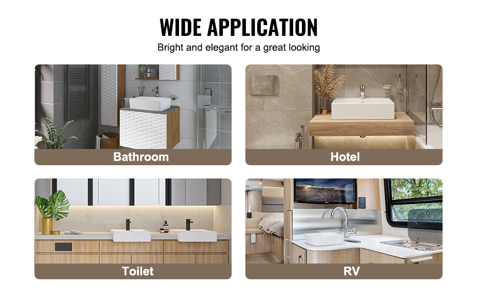 Vďaka minimalistickému obdĺžnikovému tvaru a decentnej bielej farbe tento drez vyžaruje krásu a luxus. Doplní rôzne štýly interiéru a je obľúbené medzi majiteľmi domov na použitie v kúpeľniach a toaletných stolíkoch. Je vhodný aj do hotelov, karavanov, reštaurácií, kancelárskych budov a ďalších priestorov.