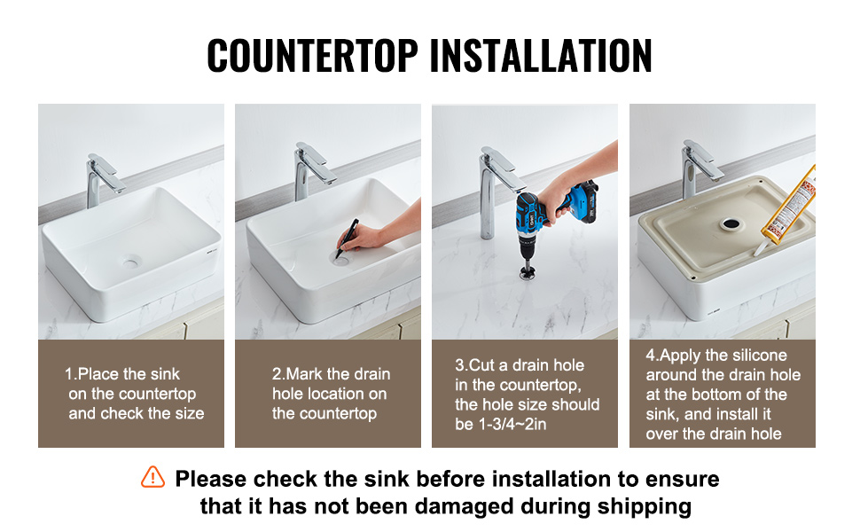 Umývadlo je obklopené penovým polstrovaním, ktoré zabraňuje poškodeniu počas prepravy. Pred inštaláciou drezu ho skontrolujte, aby ste sa uistili, že sa pri preprave nepoškodil. Pri jednoduchej inštalácii v 4 krokoch postupujte podľa pokynov v návode.