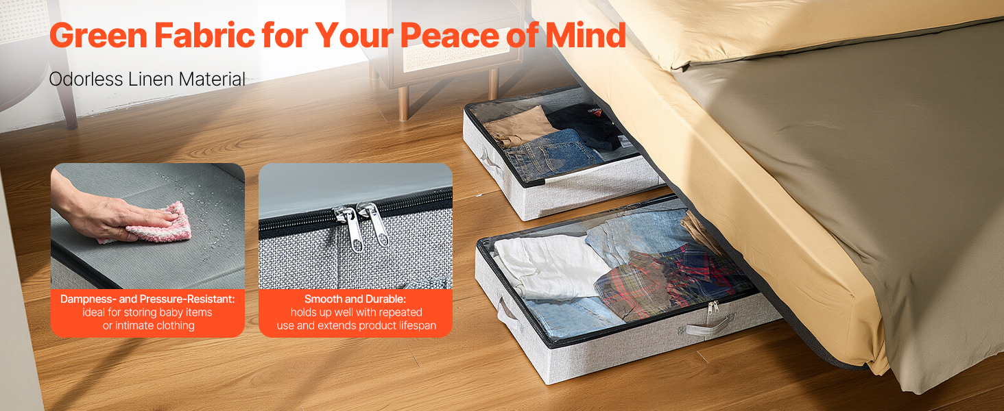 Náš úložný priestor na topánky pod posteľou používa spoľahlivé materiály bez škodlivých látok. Nie je nebezpečný pre priamy kontakt s oblečením a posteľnou bielizňou. Priedušná konštrukcia zabezpečuje cirkuláciu vzduchu, čím sa predchádza vzniku zápachu