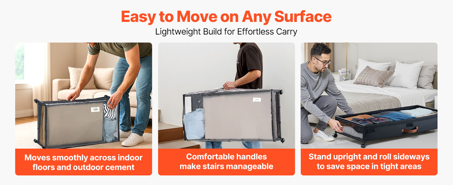 Tento rolovací úložný priestor pod posteľ je vybavený bočnou rukoväťou a štyrmi kolieskami s plynulým otáčaním o 360° (niektoré s aretáciou), vďaka čomu ľahko kĺže po rôznych povrchoch a umožňuje bezpečné umiestnenie.